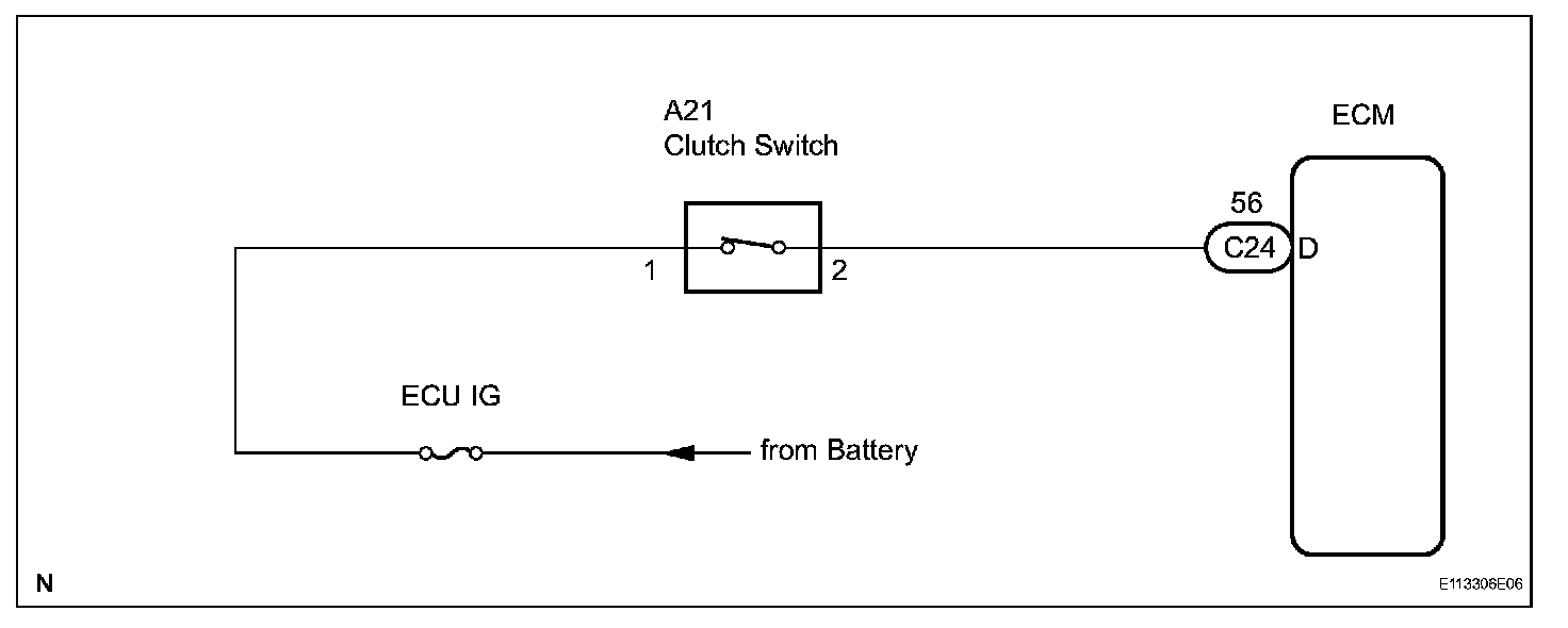 When the clutch pedal is released, the ECM receives positive (+) battery voltage through the ECU IG fuse. While depressing the clutch pedal, the clutch switch sends a signal to terminal D of the ECM. The ECM cancels cruise control drive when terminal D receives the signal.