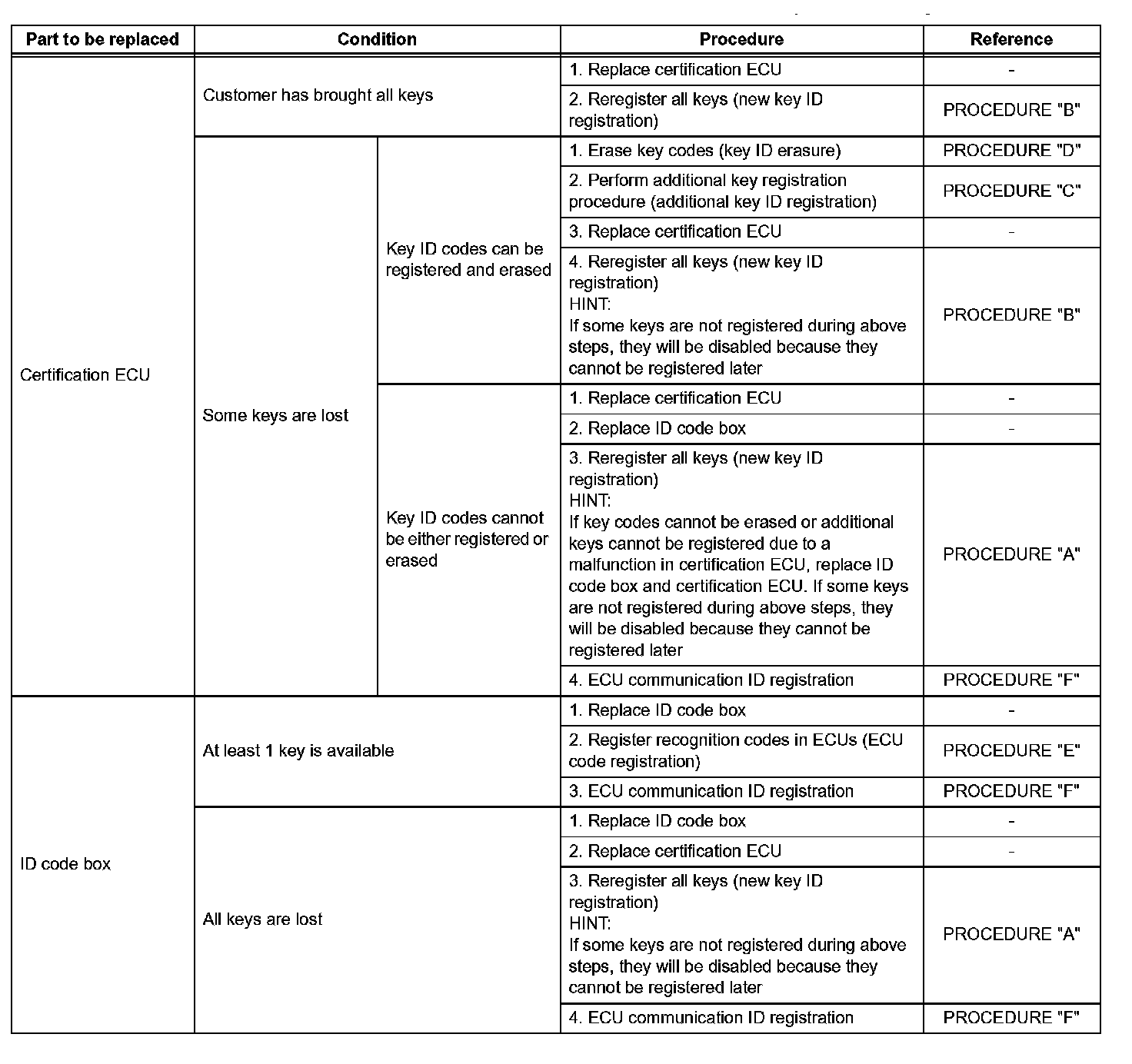- The given procedures indicated in the table require the use of the intelligent tester: New key ID registration Additional key ID registration Key ID erasure ECU code registration.
