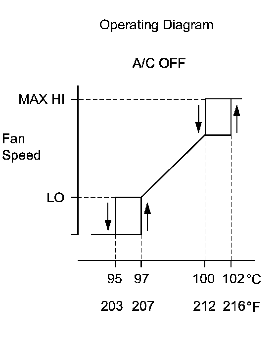 - The coolant temperature at which the fan starts operating is approximately 95°C (203°F).