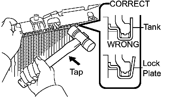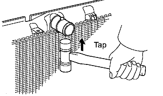 (d) Lightly tap the bracket of the radiator (or radiator hose inlet or outlet) with a soft-faced hammer and remove the tank.