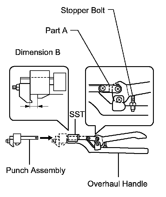 (a) Install the punch assembly to the overhaul handle, inserting it in the hole in part A as shown in the illustration.