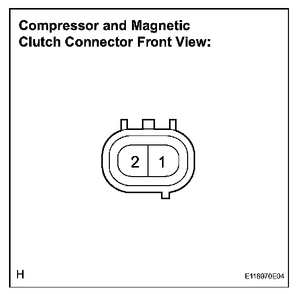 b. When connector terminal 1 is connected to the positive (+) battery terminal, check that the given occurs: 1) the magnetic clutch's operating sound can be heard, and 2) the magnetic clutch's hub and rotor lock.