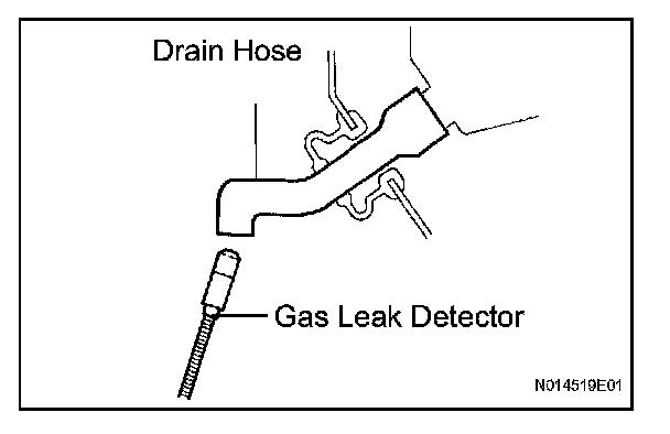 - When bringing the gas leak detector close to the drain hose, make sure that the gas leak detector does not react to volatile gases. If it is not possible to avoid interference from volatile gases, the vehicle should be lifted up to allow testing.