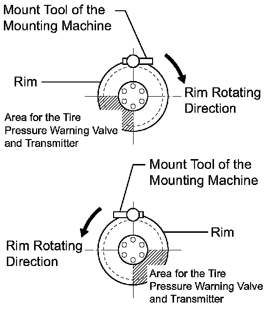 NOTICE: Be careful not to damage the tire pressure warning valve and transmitter due to interference between the tire pressure warning valve and transmitter and the tire bead.