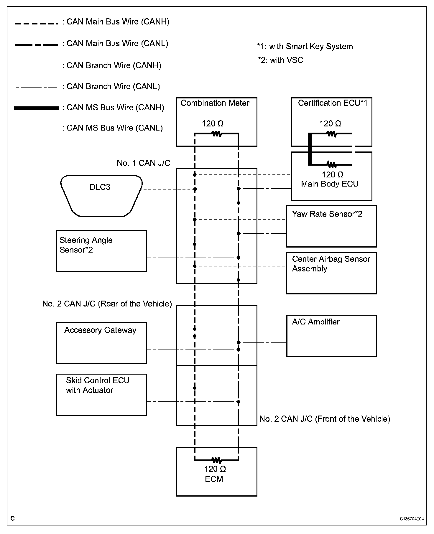a. Two different CAN busses are used. The CAN busses are classified into two types based on typical communication speed. The HS-CAN bus is a high-speed communication bus that is used for powertrain, chassis, and some body electrical communication. The HS-CAN bus is referred to as the "CAN bus" and it operates at speeds of approximately 500 kbps. Terminating resistors for the HS-CAN bus are located in the ECM and combination meter. The MS-CAN bus is a medium-speed communication bus that is used for body electrical communication. The MS-CAN bus is referred to as the "MS bus" and it operates at speeds of approximately 250 kbps. Terminating resistors for the MS-CAN bus are located in the main body ECU and the certification ECU. The resistance of the MS-CAN bus cannot be measured from the DLC3 connector. Communication between these two networks is handled via the main body ECU, which acts as a gateway ECU.
