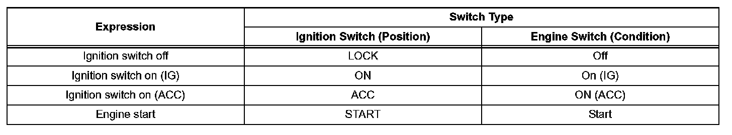 The type of ignition switch used on this model differs according to the specifications of the vehicle. The expressions listed in the table are used.