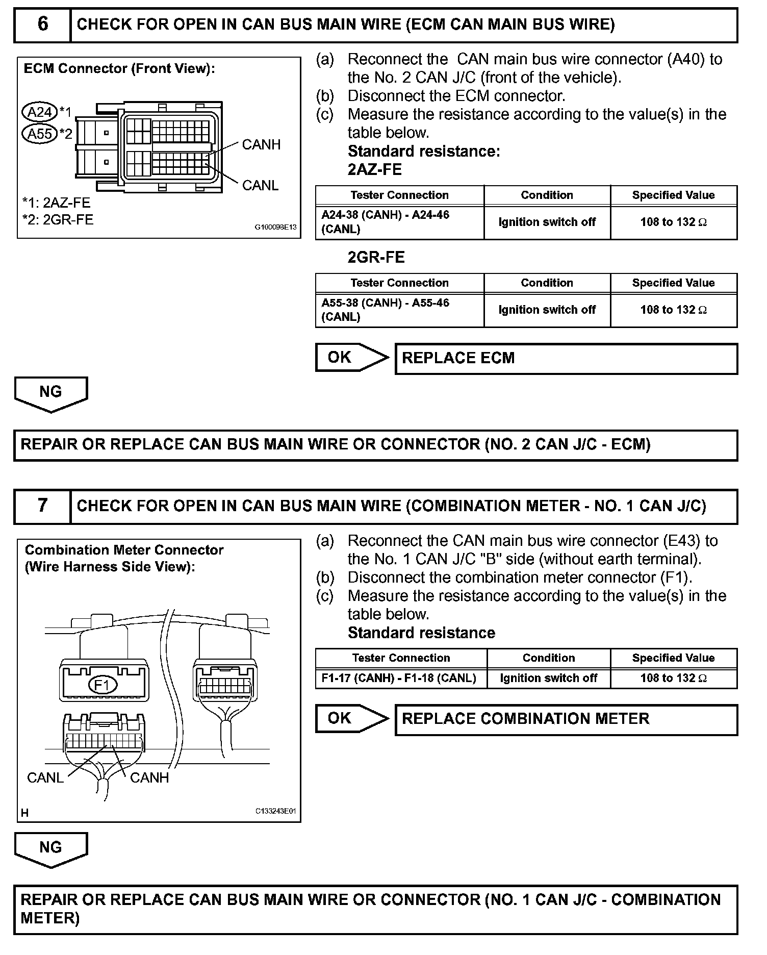 There may be an open circuit in the CAN main bus wire and/or the DLC3 branch wire when the resistance between terminals 6 (CANH) and 14 (CANL) of the DLC3 is 69 ohms or more.