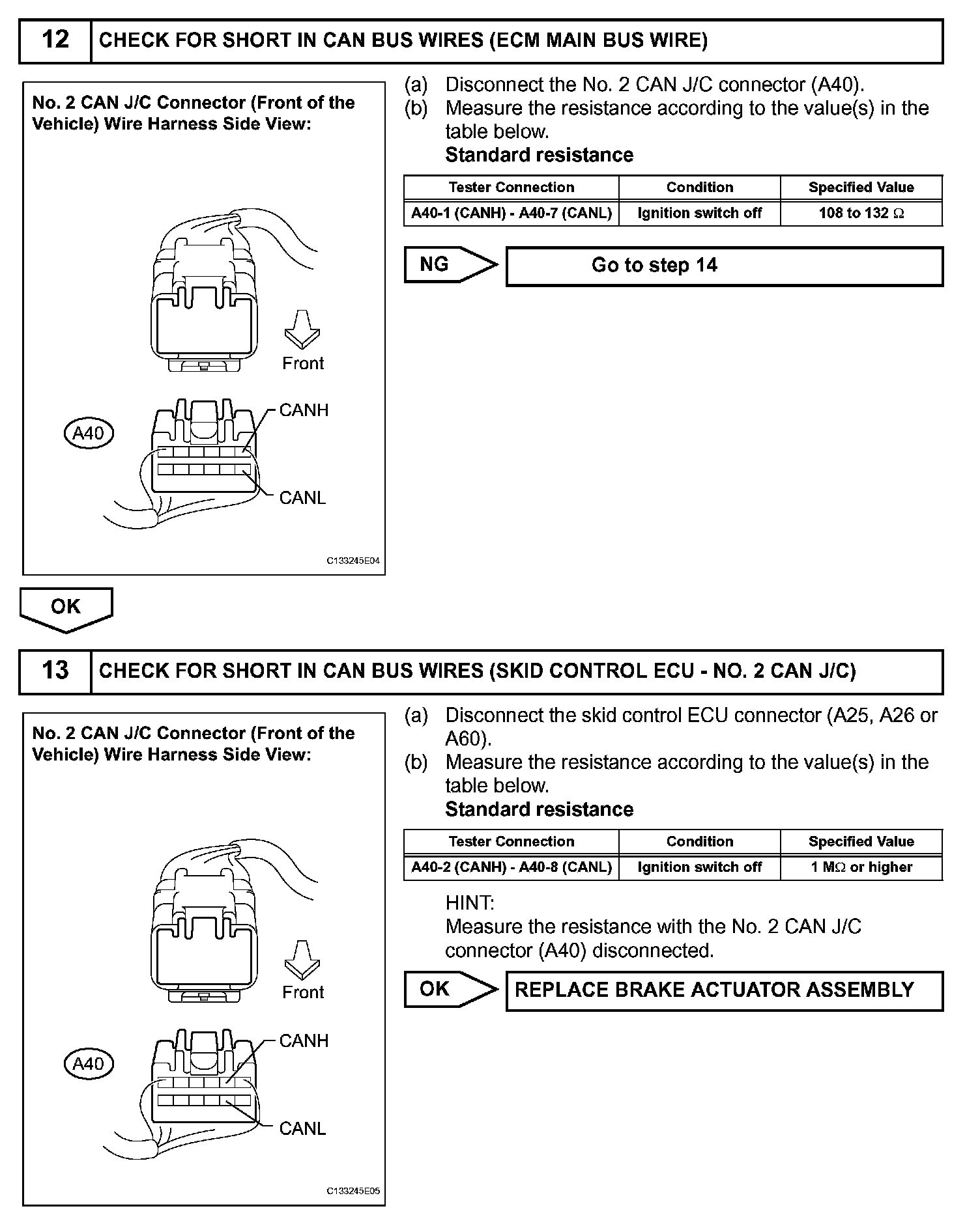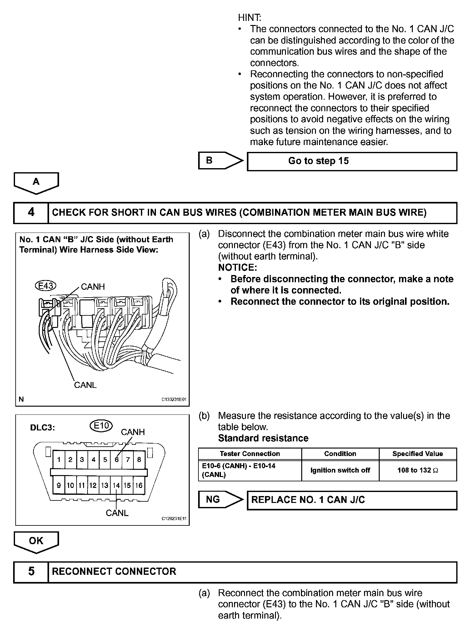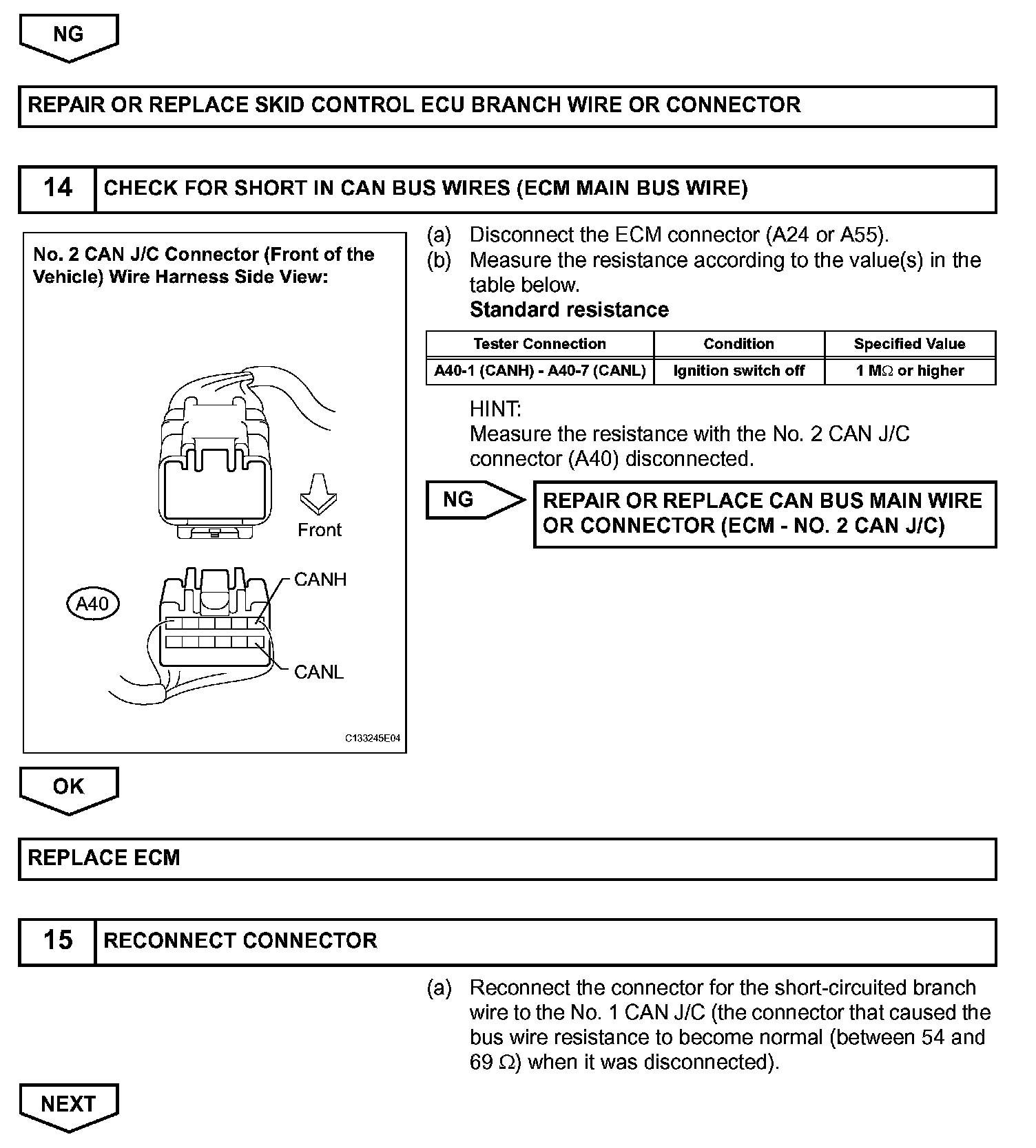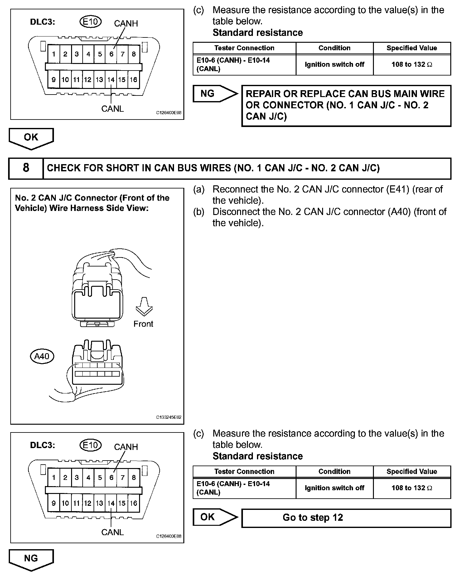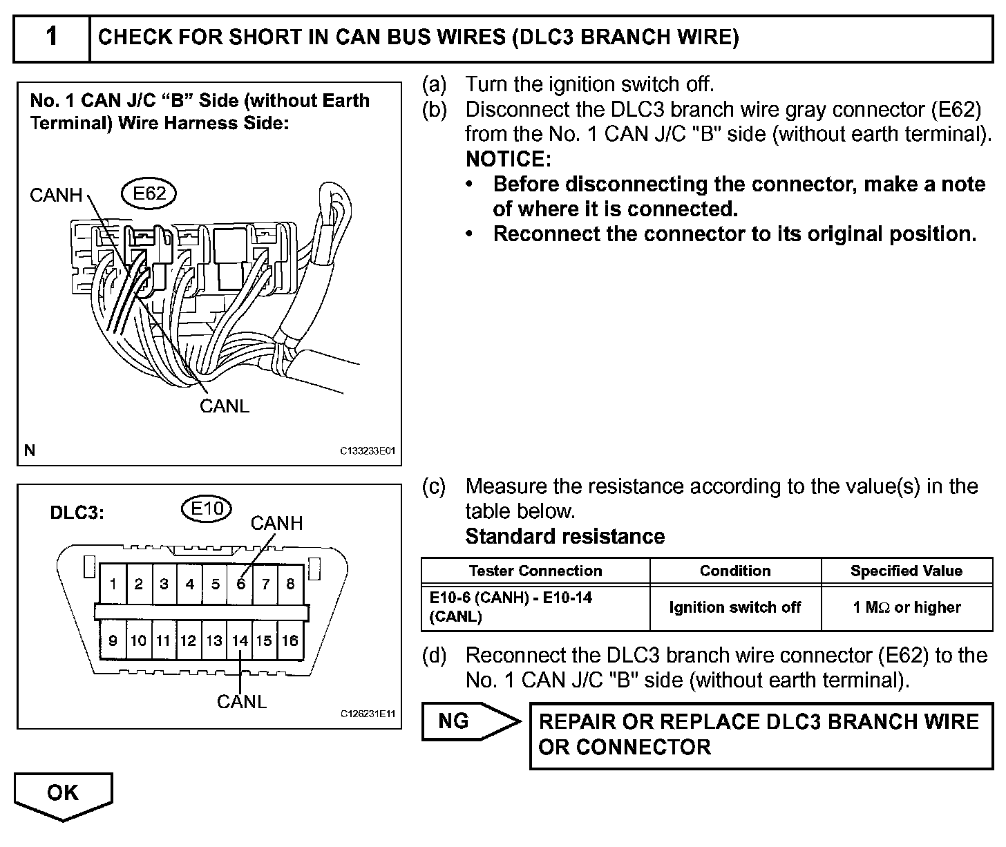The CAN bus wires are considered to be shorted when the resistance between terminals 6 (CANH) and 14 (CANL) of the DLC3 is below 54 ohms.