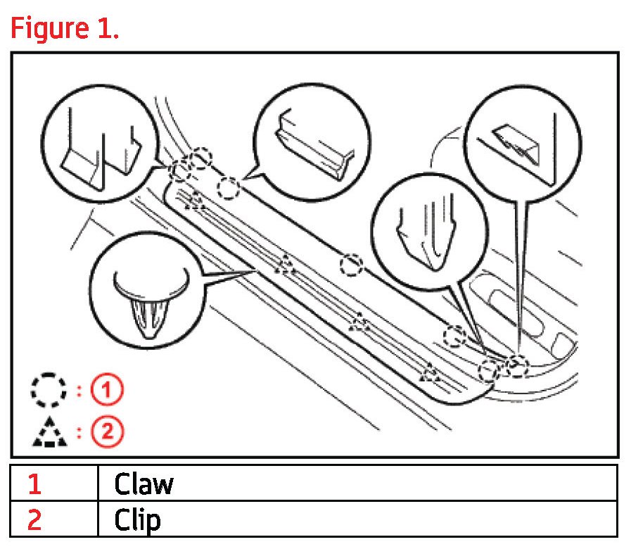 3. Remove the LH front door scuffle plate by disengaging the 7 claws and 4 clips.