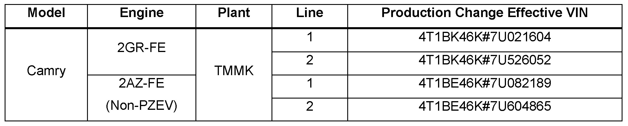 - 2007 model year NAP (North American produced) Camry vehicles produced BEFORE the Production Change Effective VINs shown below.
