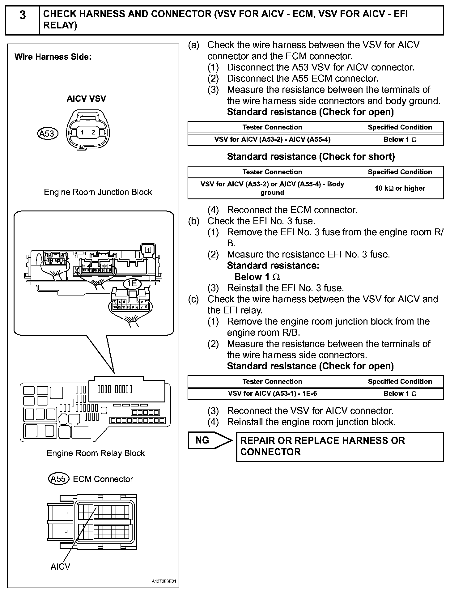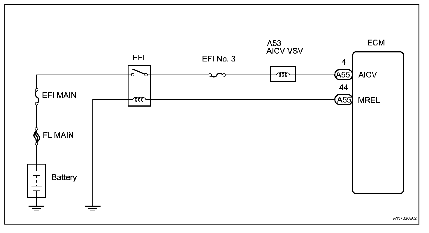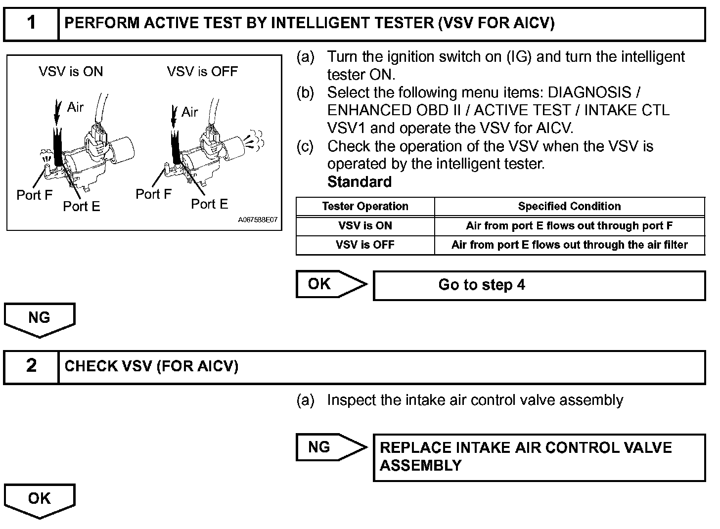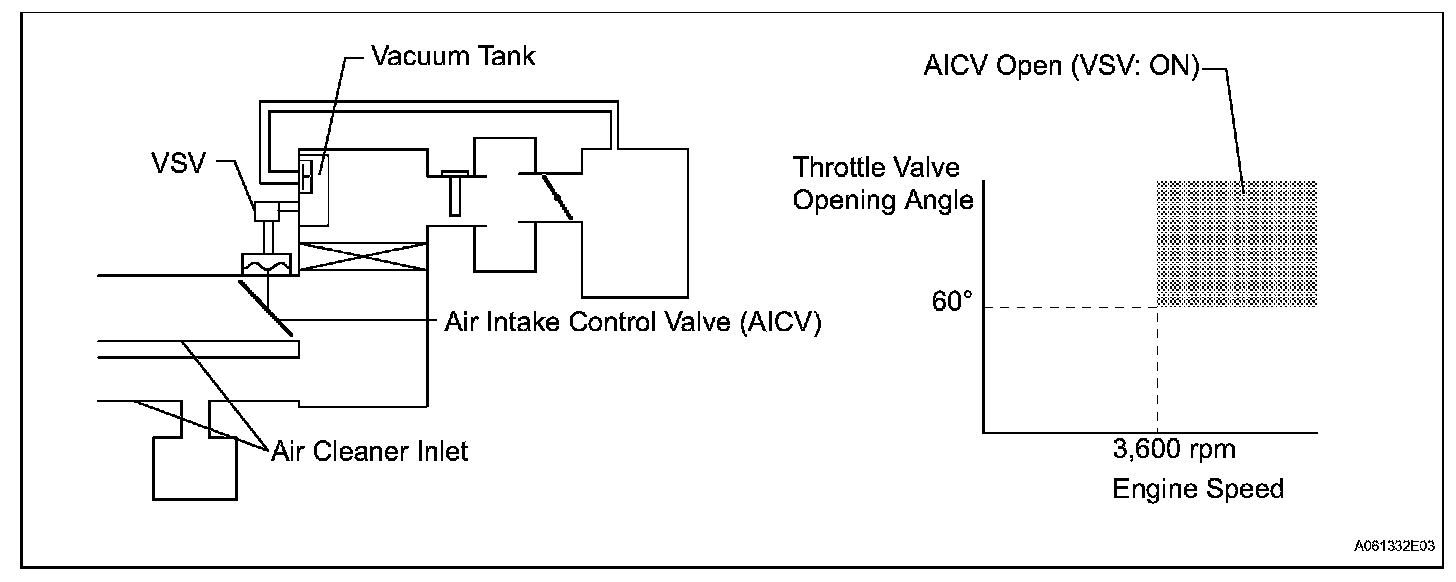 When the engine is operating in the low-to-mid speed range, this control operates the AICV to close one of the air cleaner inlets. When the engine speed is more than 3,600 rpm and the opening angle of the throttle valve is more than 60°, the ECM activates the VSV and opens the AICV.