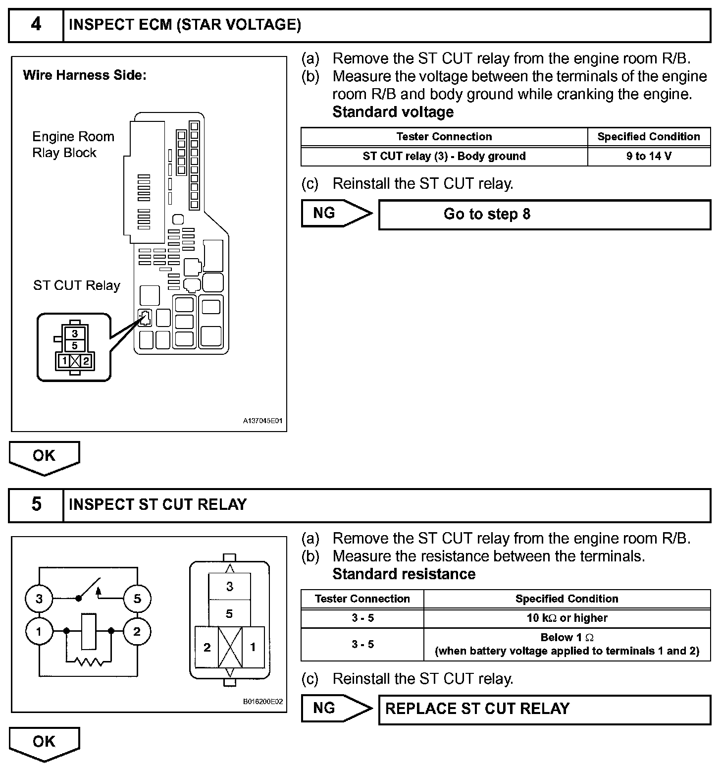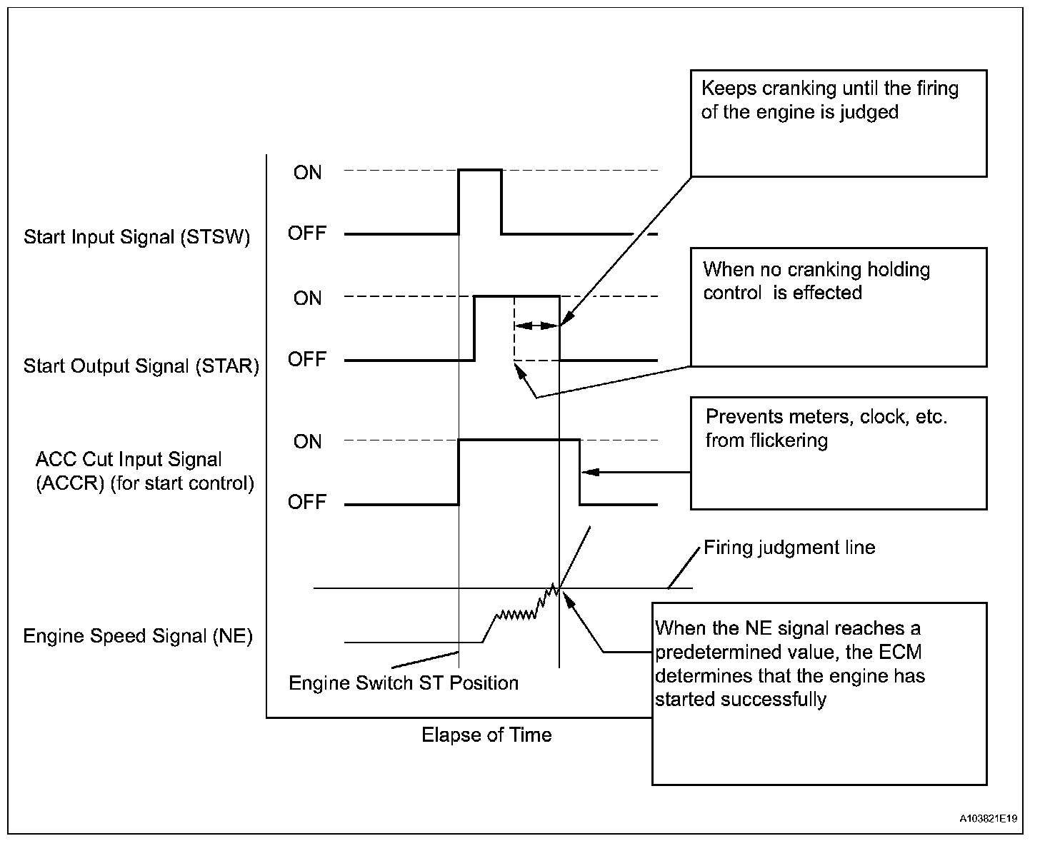 The cranking holding control system provides current to the starter when the ECM detects the engine switch's start signal (STSW). When the ECM performs a firing judgment, the system cuts current to the starter. When an ECM receives the STSW signal, it turns on the ST CUT relay, which prevents flickering of the combination meter, clock, audio system, etc. Also, the ECM sends a signal to the ECM's STAR terminal. Then the STAR output signal travels through the park/neutral position (PNP) switch to the STARTER relay, causing the starter to activate.