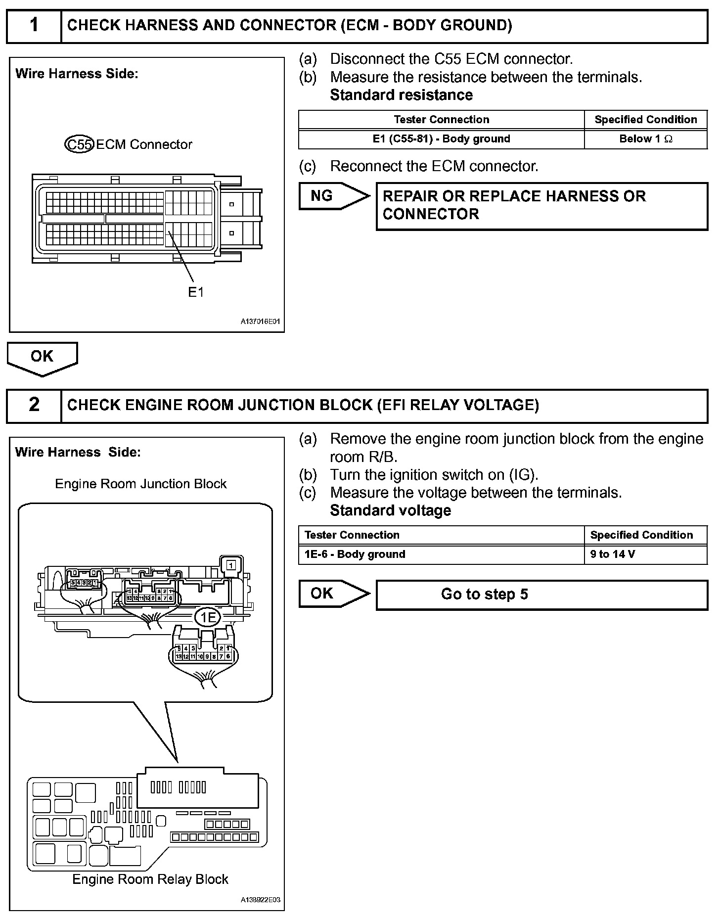 When the ignition switch is turned on (IG), voltage from the ECM's MREL terminal applies to the engine room junction block (EFI relay). This causes the contacts of the engine room junction block (EFI relay) to close, which supplies power to terminal +B or +B1 of the ECM.