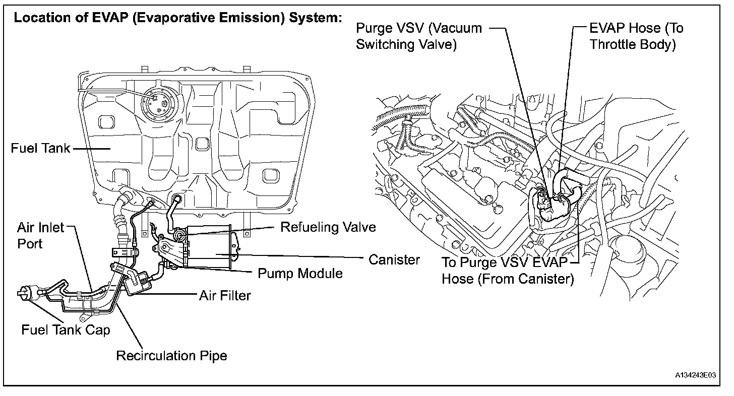 While the engine is running, if a predetermined condition (closed-loop, etc.) is met, the purge VSV is opened by the ECM and fuel vapors stored in the canister are purged into the intake manifold. The ECM changes the duty cycle ratio of the purge VSV to control purge flow volume.