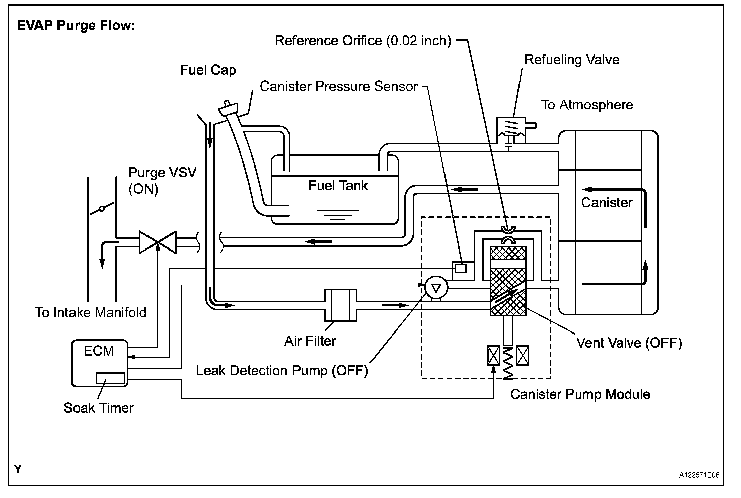 The purge flow volume is also determined by the intake manifold pressure. Atmospheric pressure is allowed into the canister through the vent valve to ensure that the purge flow is maintained when negative pressure (vacuum) is applied to the canister.