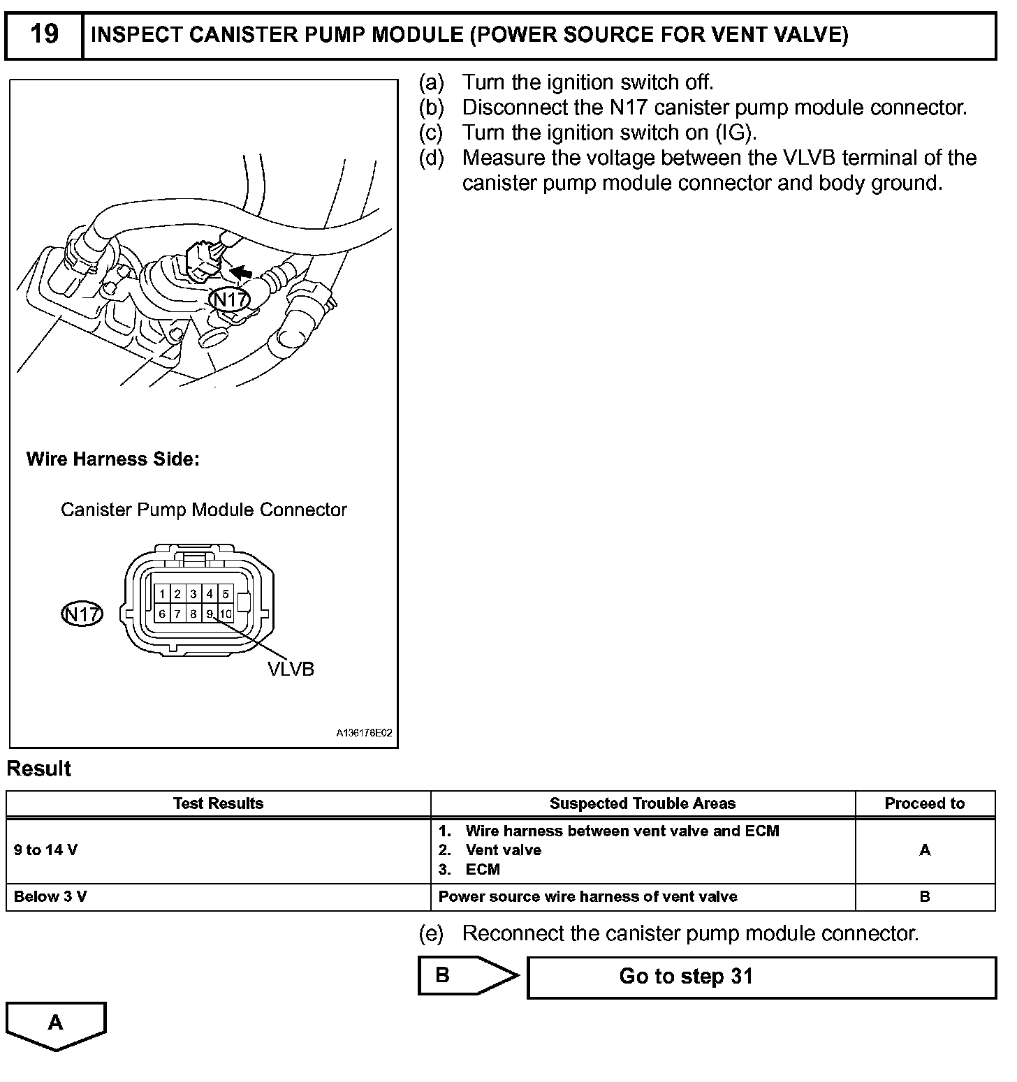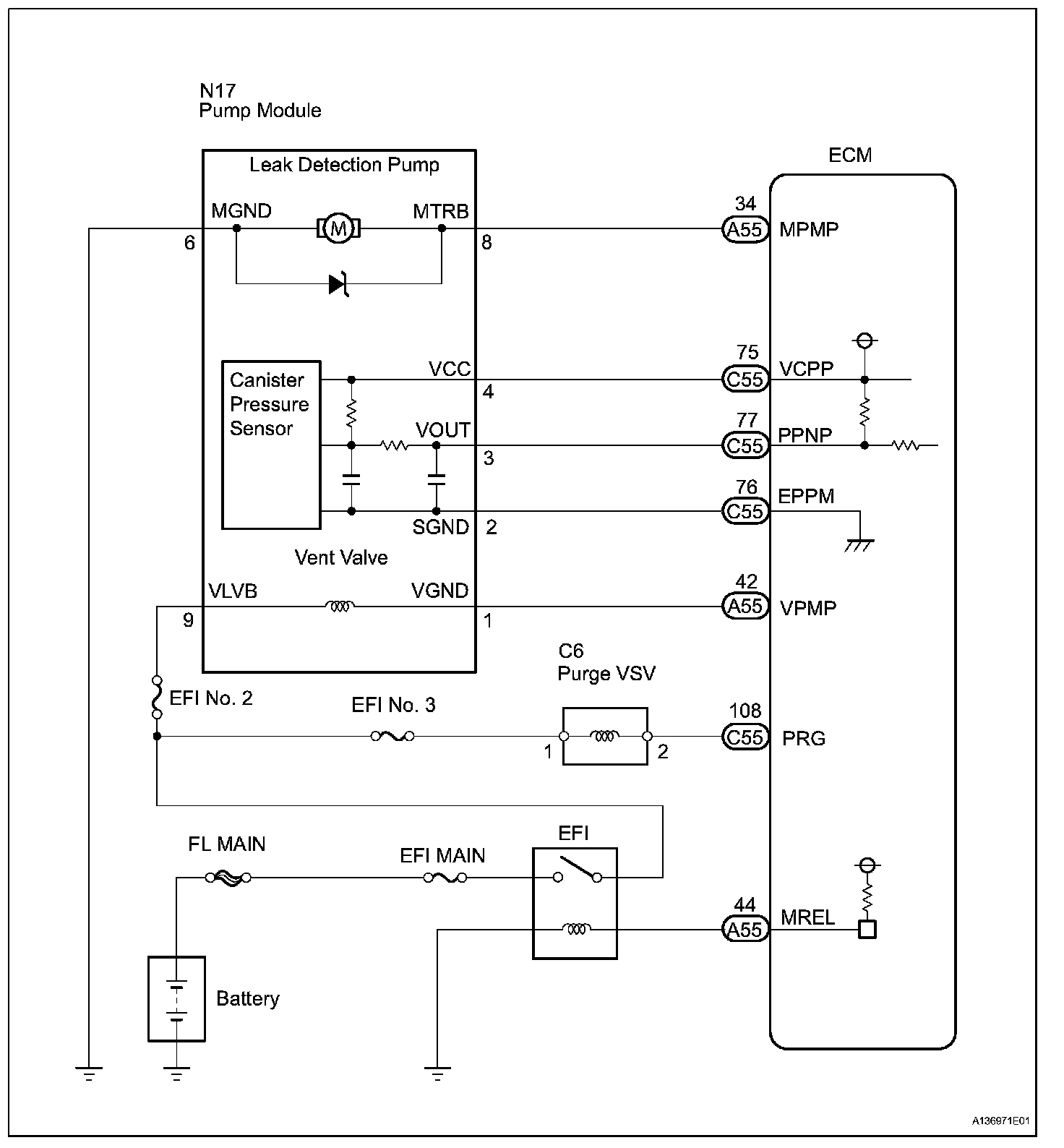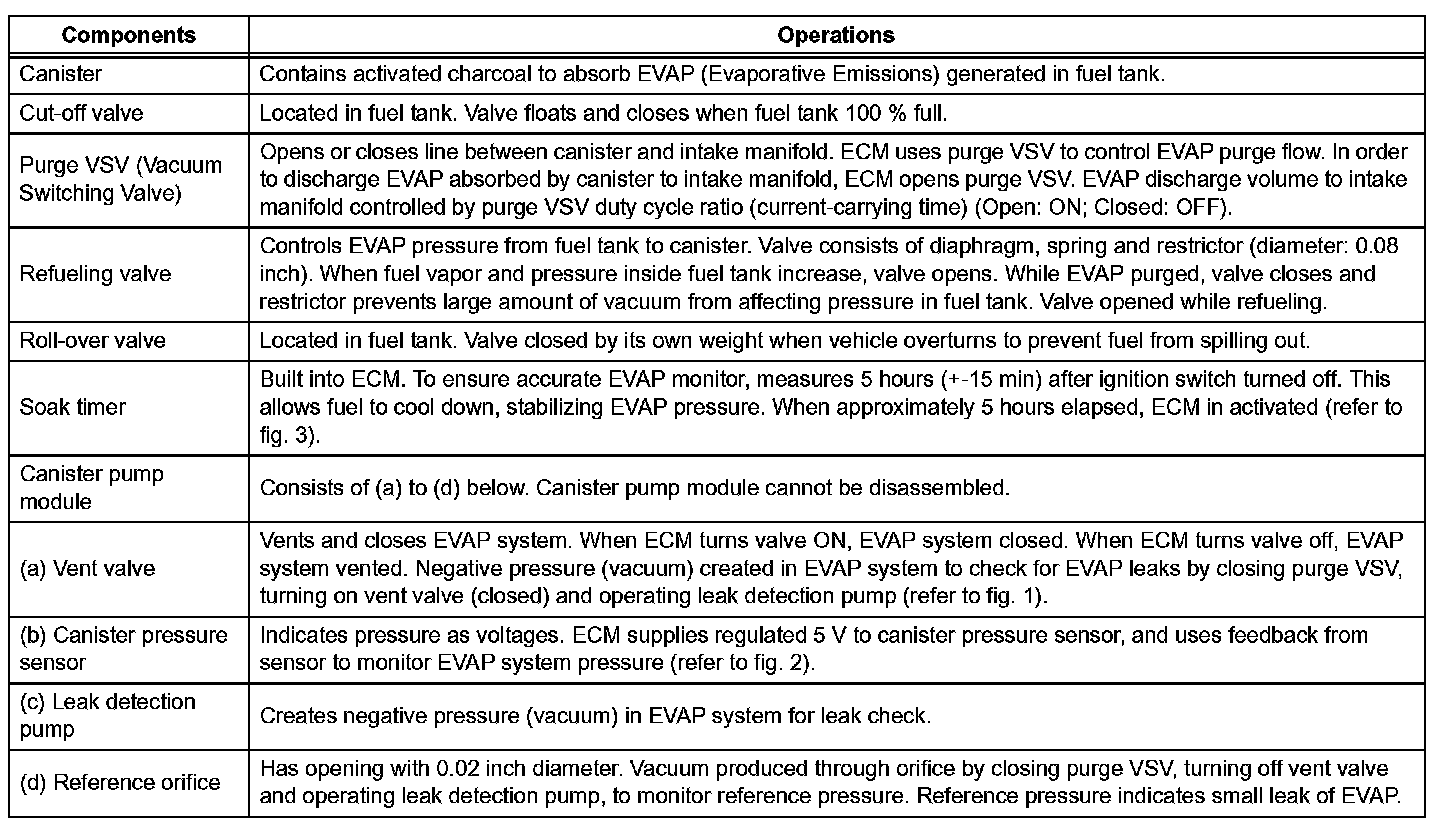 The leak detection pump creates negative pressure (vacuum) in the EVAP system and the pressure is measured. Finally, the ECM monitors for leaks from the EVAP system, and malfunctions in both the canister pump module and purge VSV, based on the EVAP pressure.