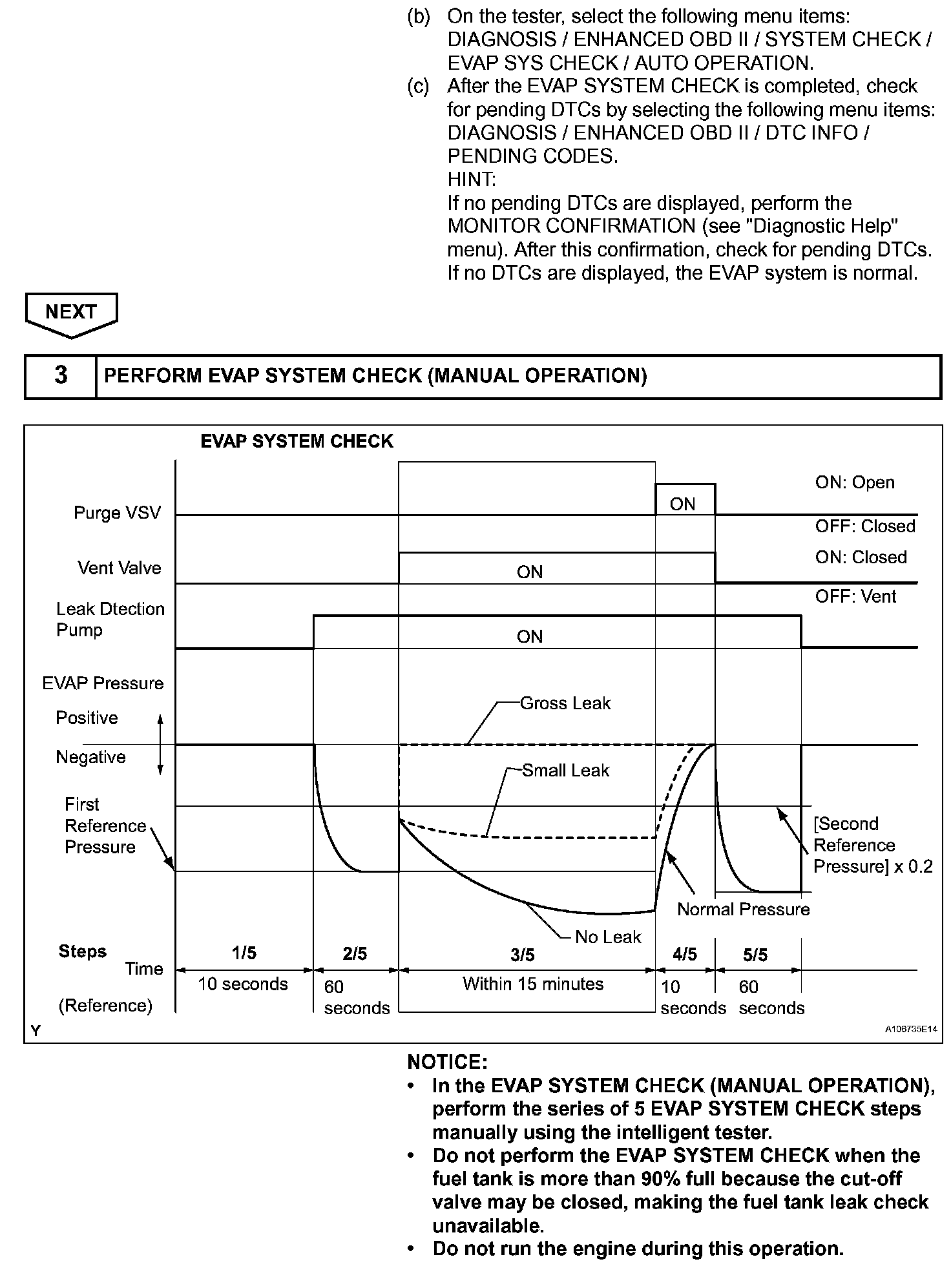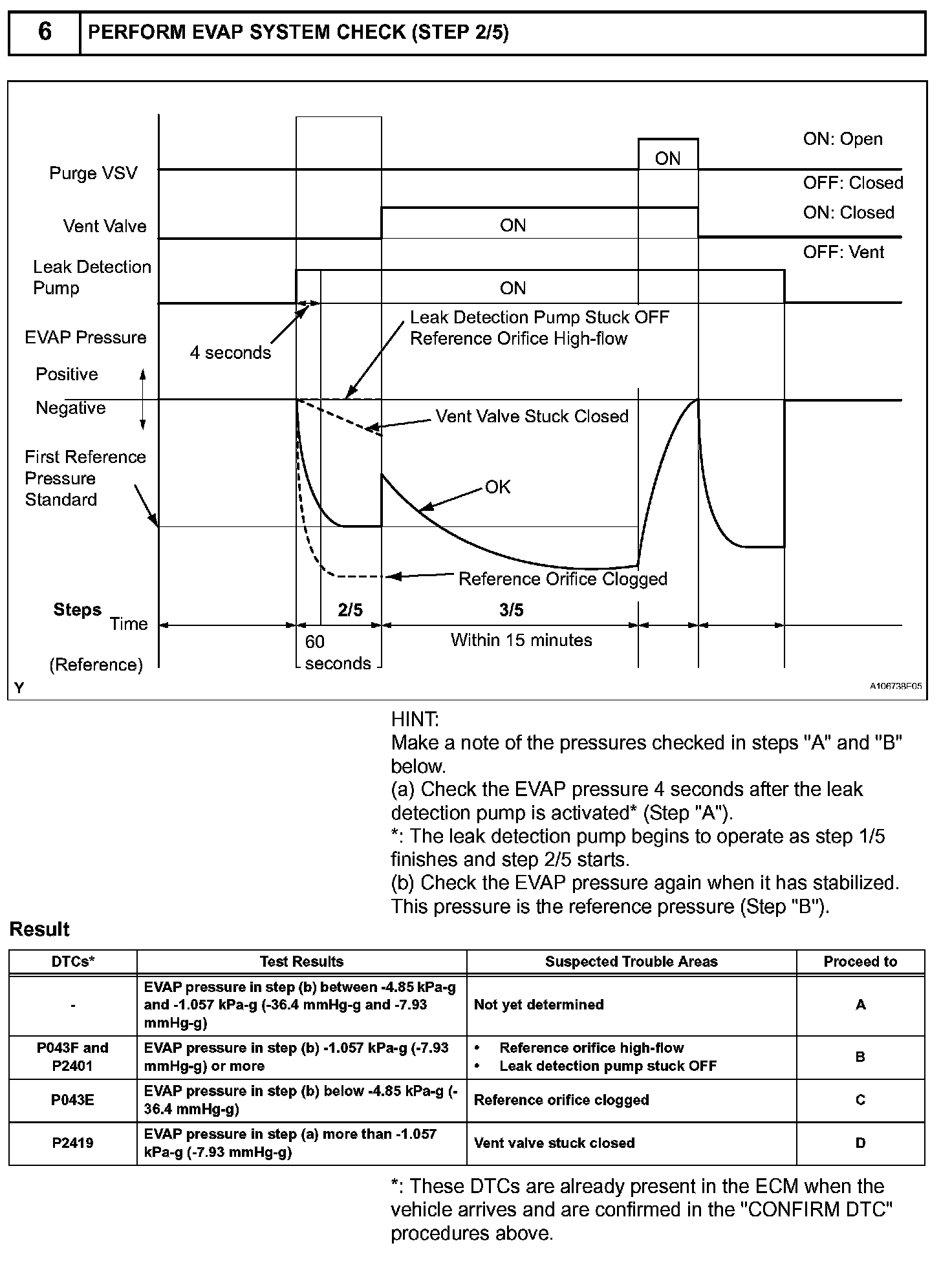 NOTE: If the reference pressure difference between the first and second checks is greater than the specification, all the DTCs relating to the reference pressure (P043E, P043F, P2401, P2402 and P2419) are stored.