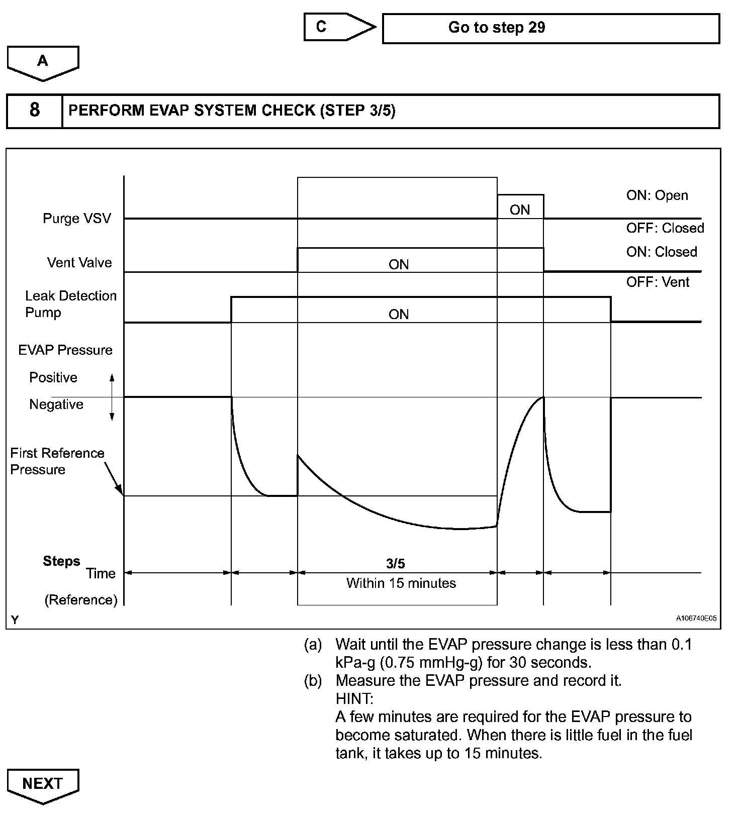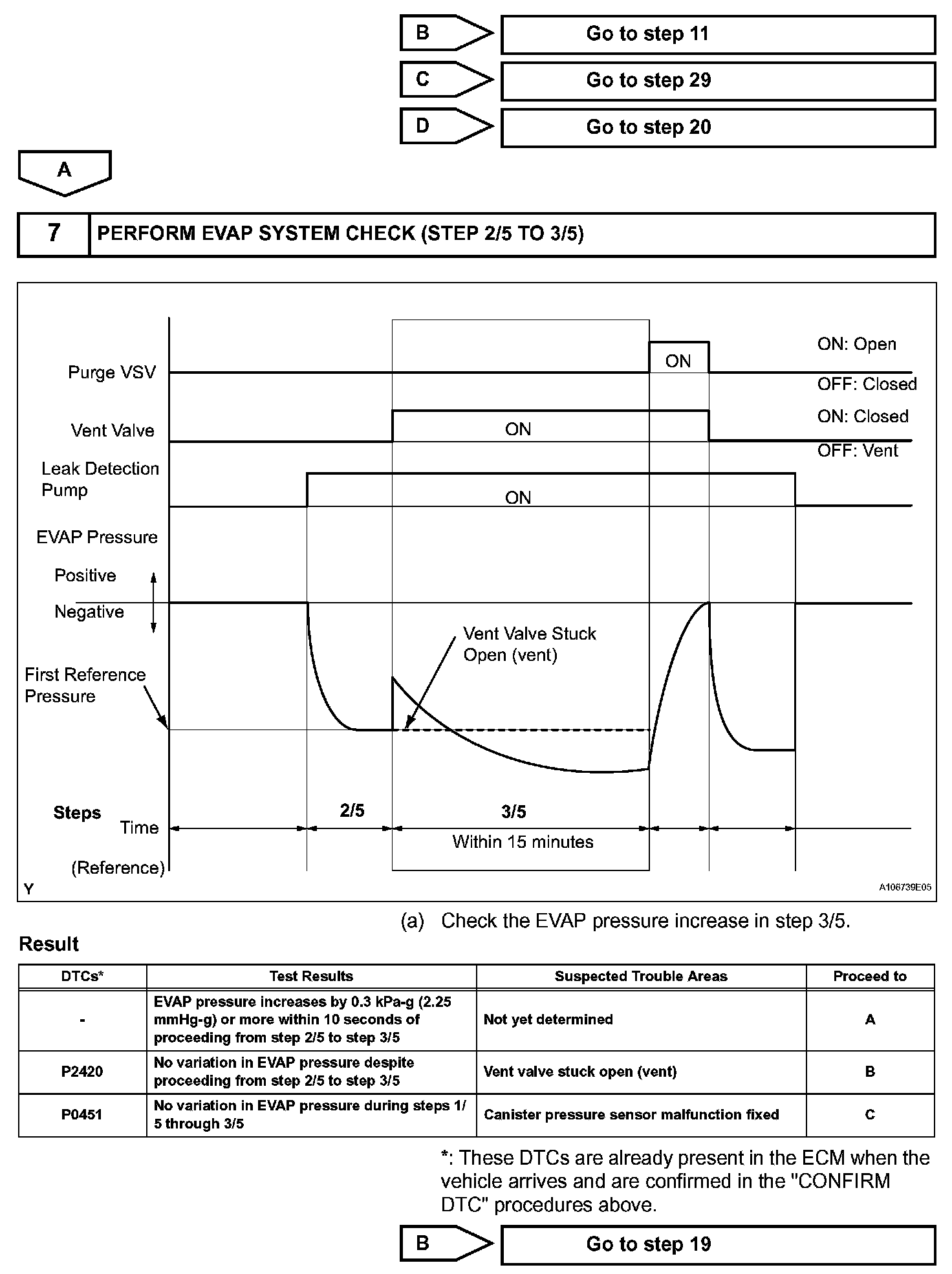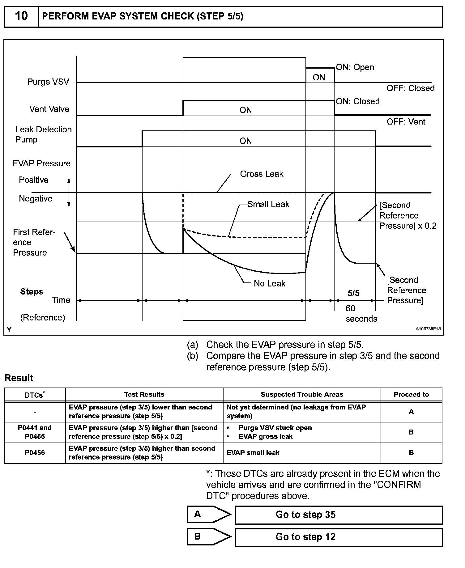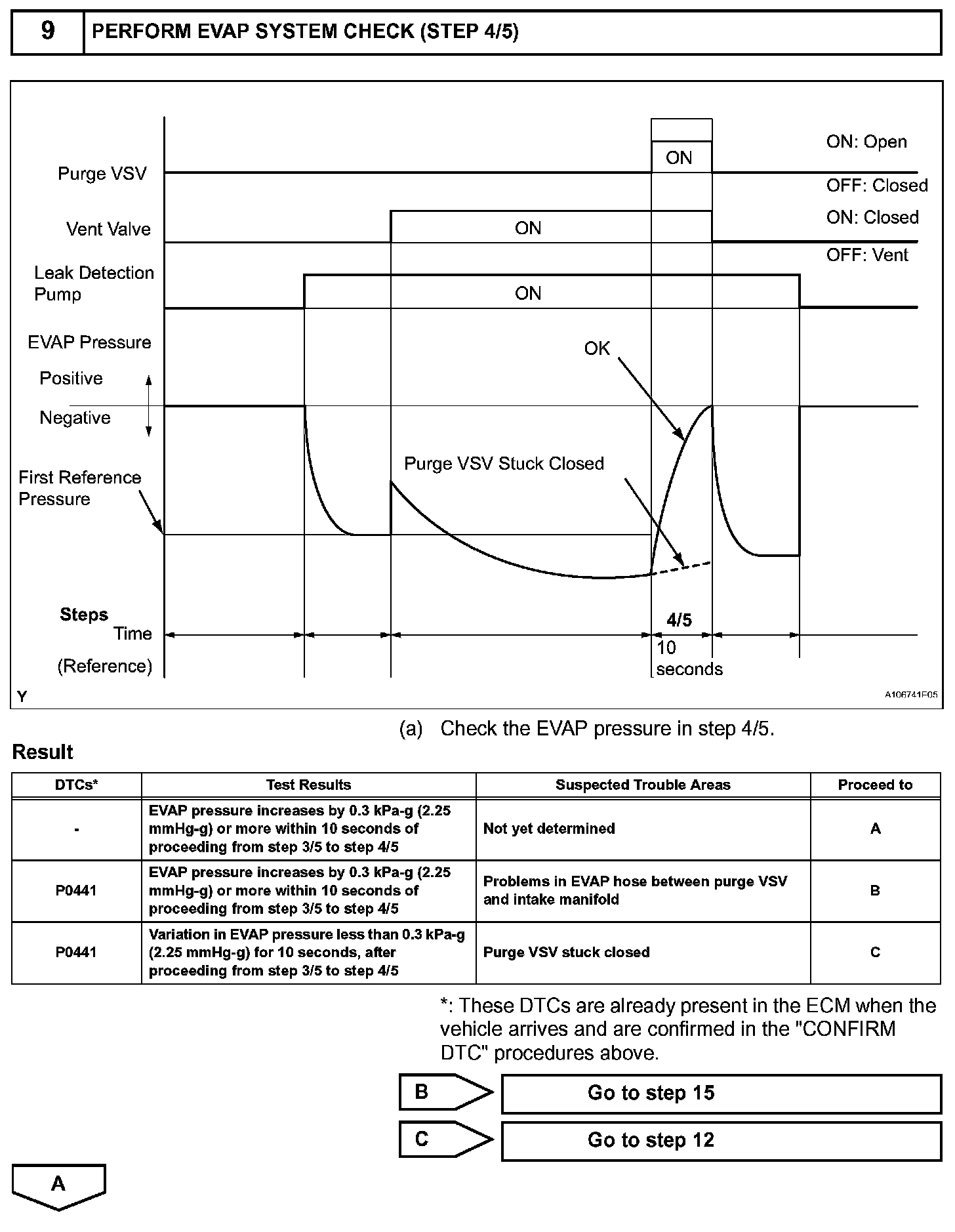 The vent valve is turned OFF (open) and the EVAP pressure is measured. If the variation in the pressure is less than 0.5 kPa-g (3.75 mmHg-g), the ECM interprets this as the purge VSV being stuck closed, and illuminates the MIL and sets DTC P0441 (2 trip detection logic).