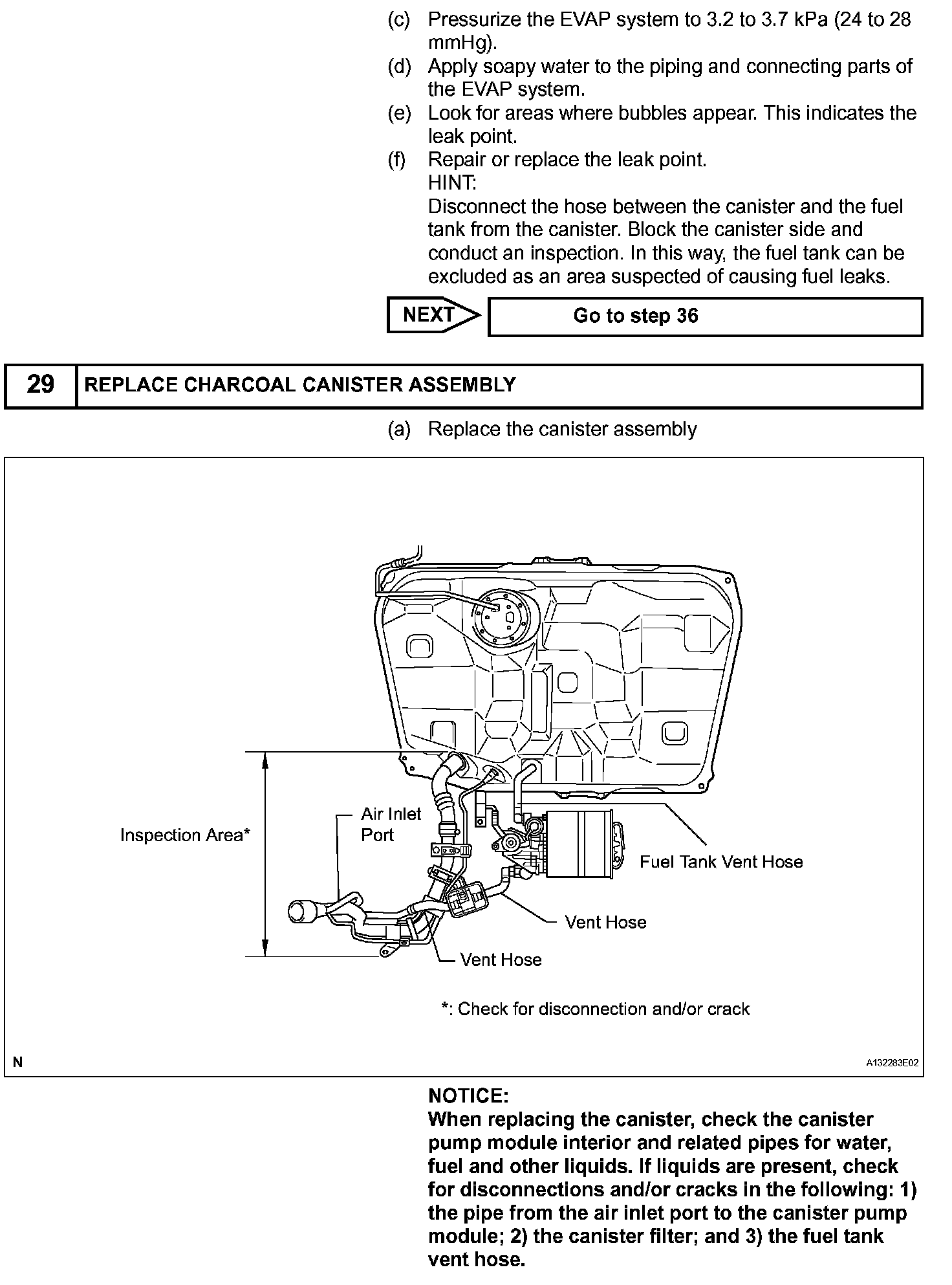 NOTE: In this vehicle's EVAP system, turning ON the vent valve does not seal off the EVAP system. To check for leaks in the EVAP system, disconnect the air inlet vent hose and apply pressure from the atmospheric side of the canister.