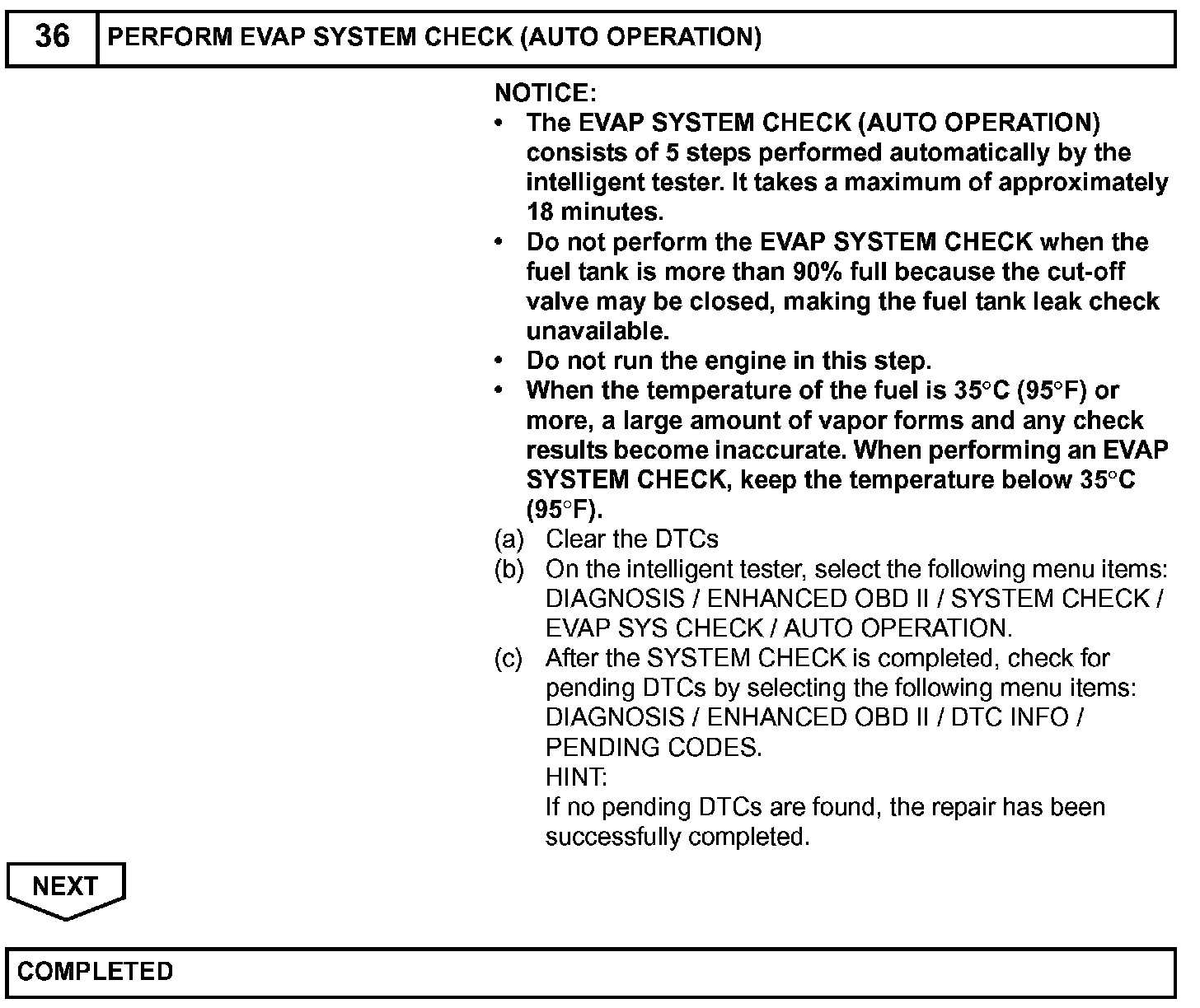 - Using intelligent tester monitor results enables the EVAP (Evaporative Emission) system to be confirmed.