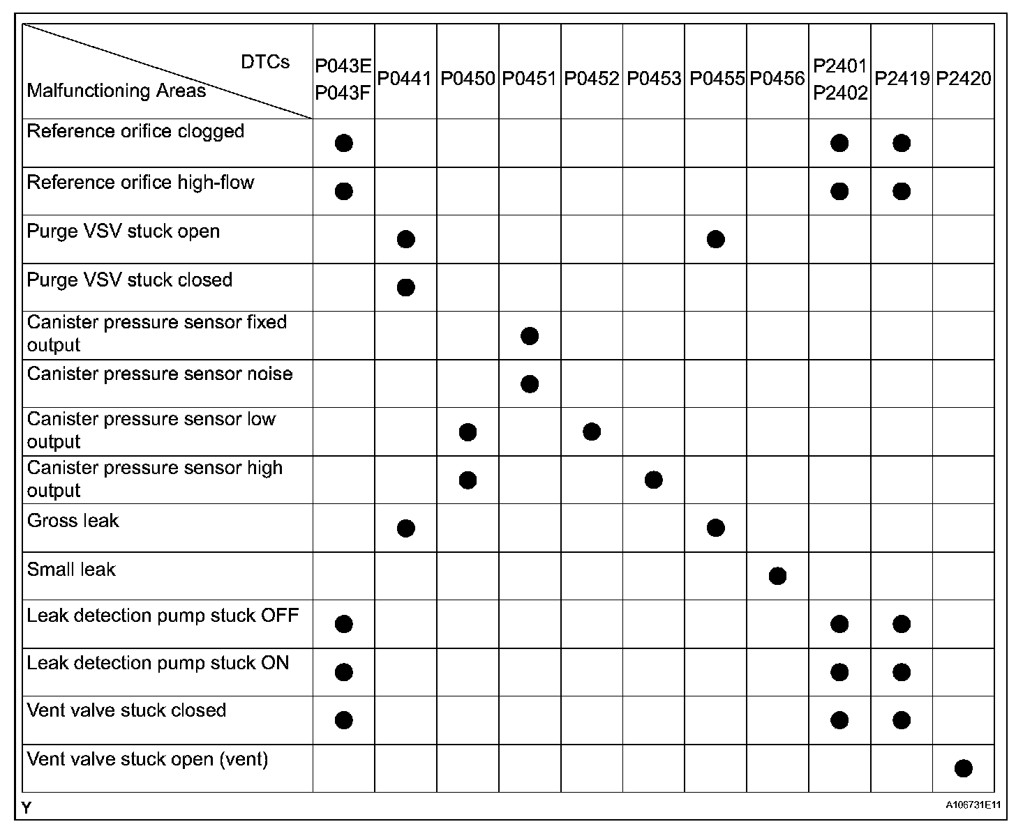 If any EVAP system DTCs are set, the malfunctioning area can be determined using the table given.