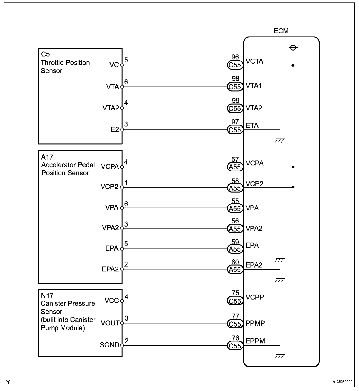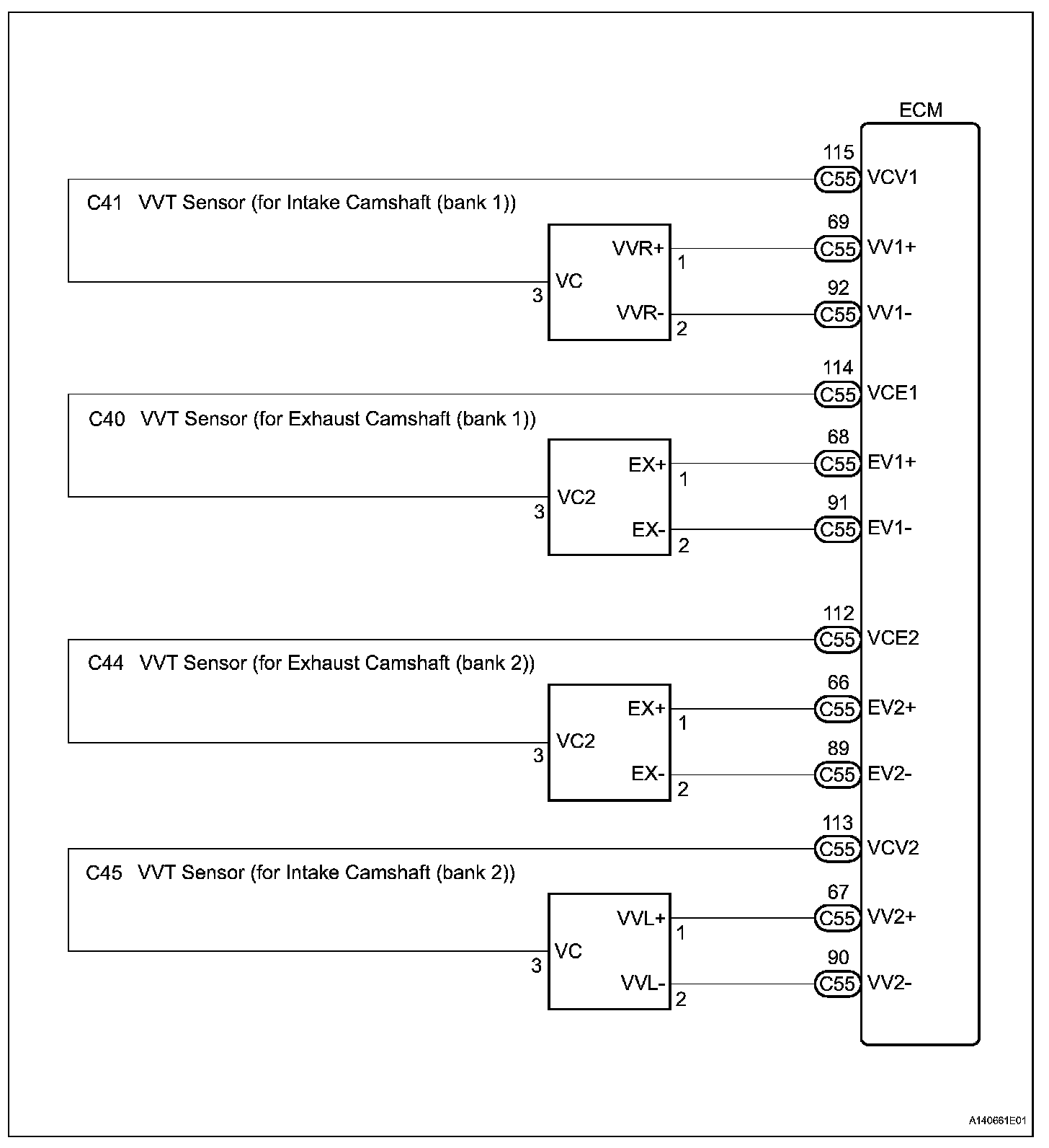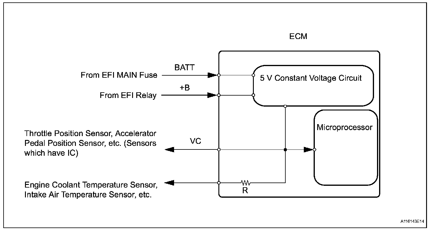 The ECM constantly uses 5 V from the battery voltages supplied to the +B (BATT) terminal to operate the microprocessor. The ECM also provides this power to the sensors through the VC output circuit.