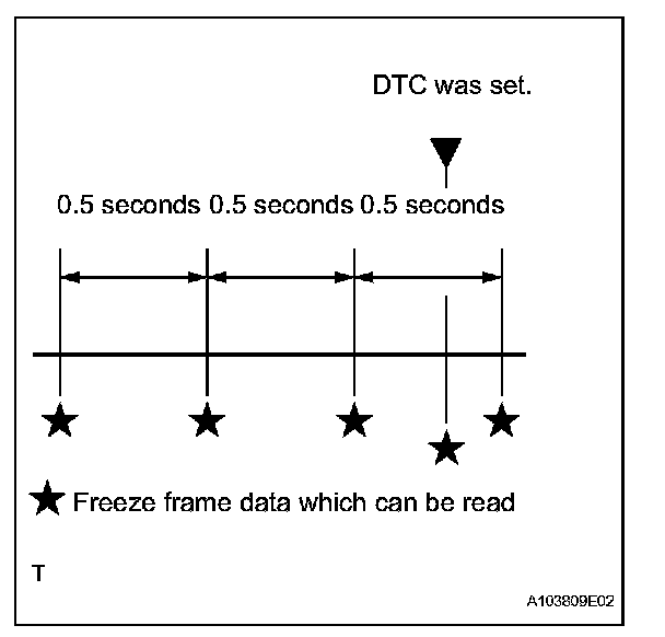 The ECM records engine conditions as freeze frame data every 0.5 seconds. Using the intelligent tester, five separate sets of freeze frame data, including the data values at the time when the DTC was set, can be checked.