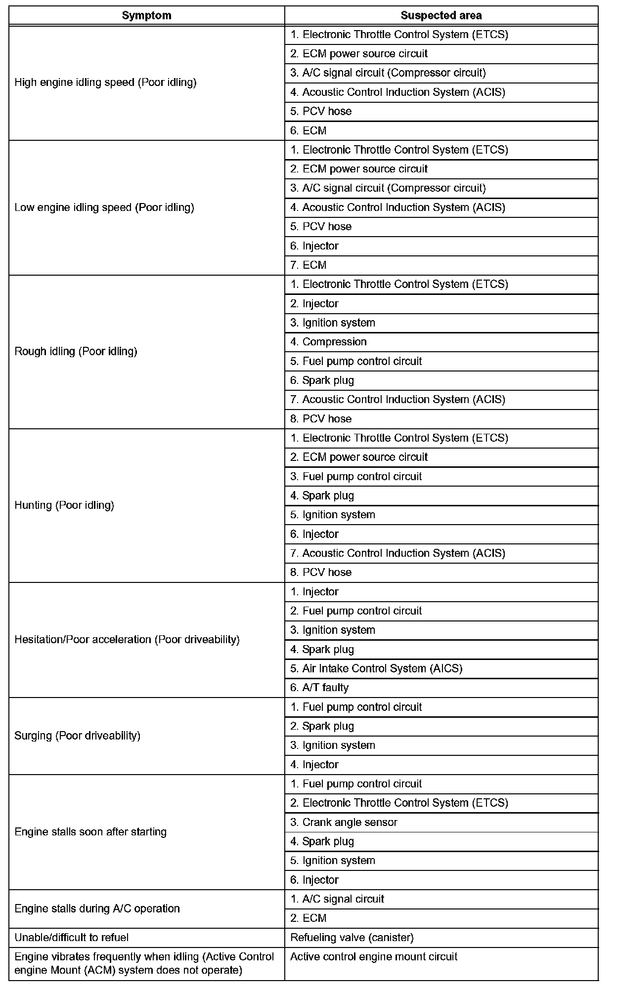 HINT: When a malfunction is not confirmed by a DTC (Diagnostic Trouble Code) check and the cause of problem cannot be identified through a basic inspection, troubleshoot according to the priority order indicated in the table given.