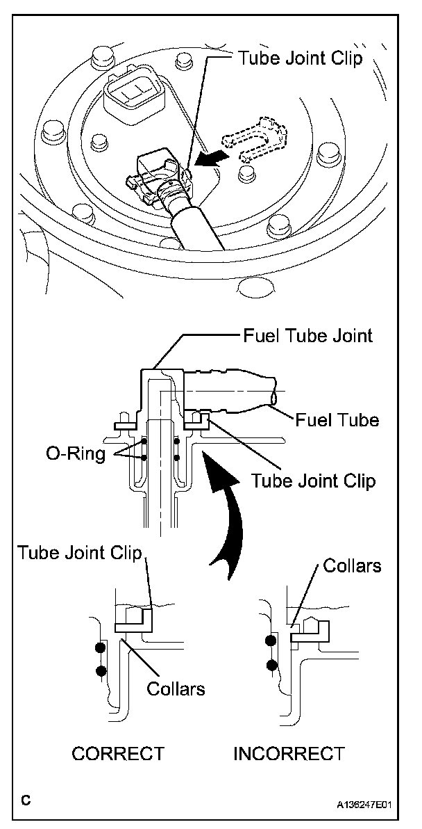 - Check that the tube joint clip is on the collar of the fuel tube joint.