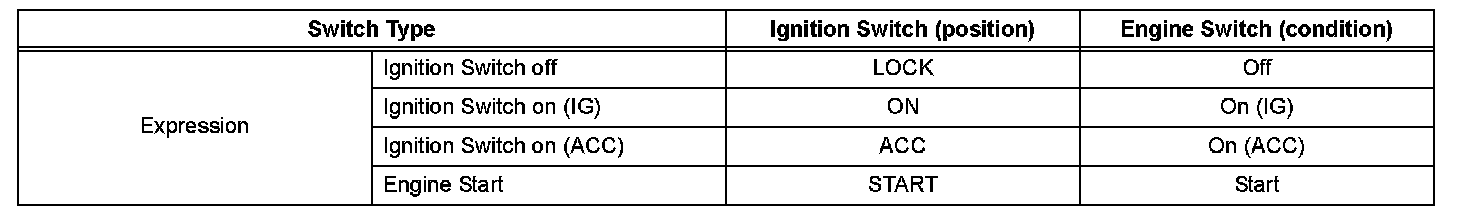 a. The type of the ignition switch used on this model differs according to the specifications of the vehicle. The expressions listed in the table given are used in this section.