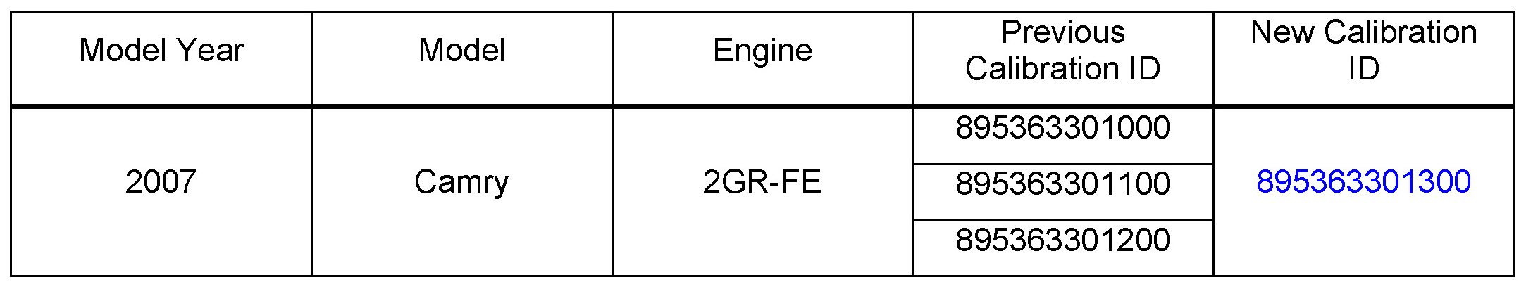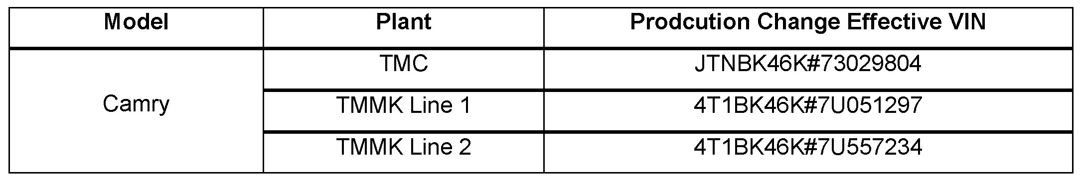 - 2007 model year Camry (V6) vehicles produced BEFORE the Production Change Effective VIN shown below.