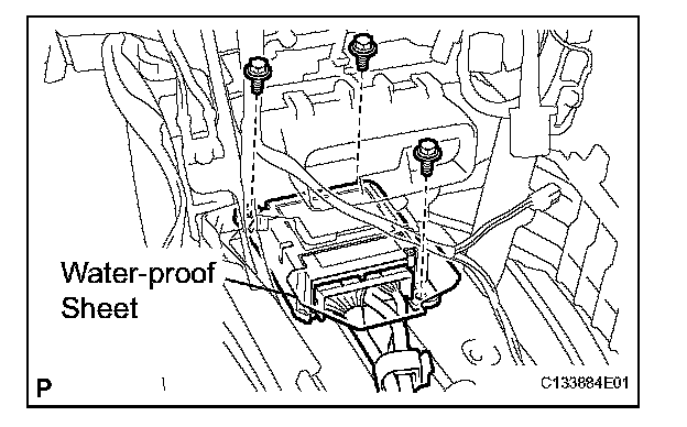 - When installing the center airbag sensor assembly, be careful that the SRS wiring does not interfere with other parts and that it is not pinched between other parts.