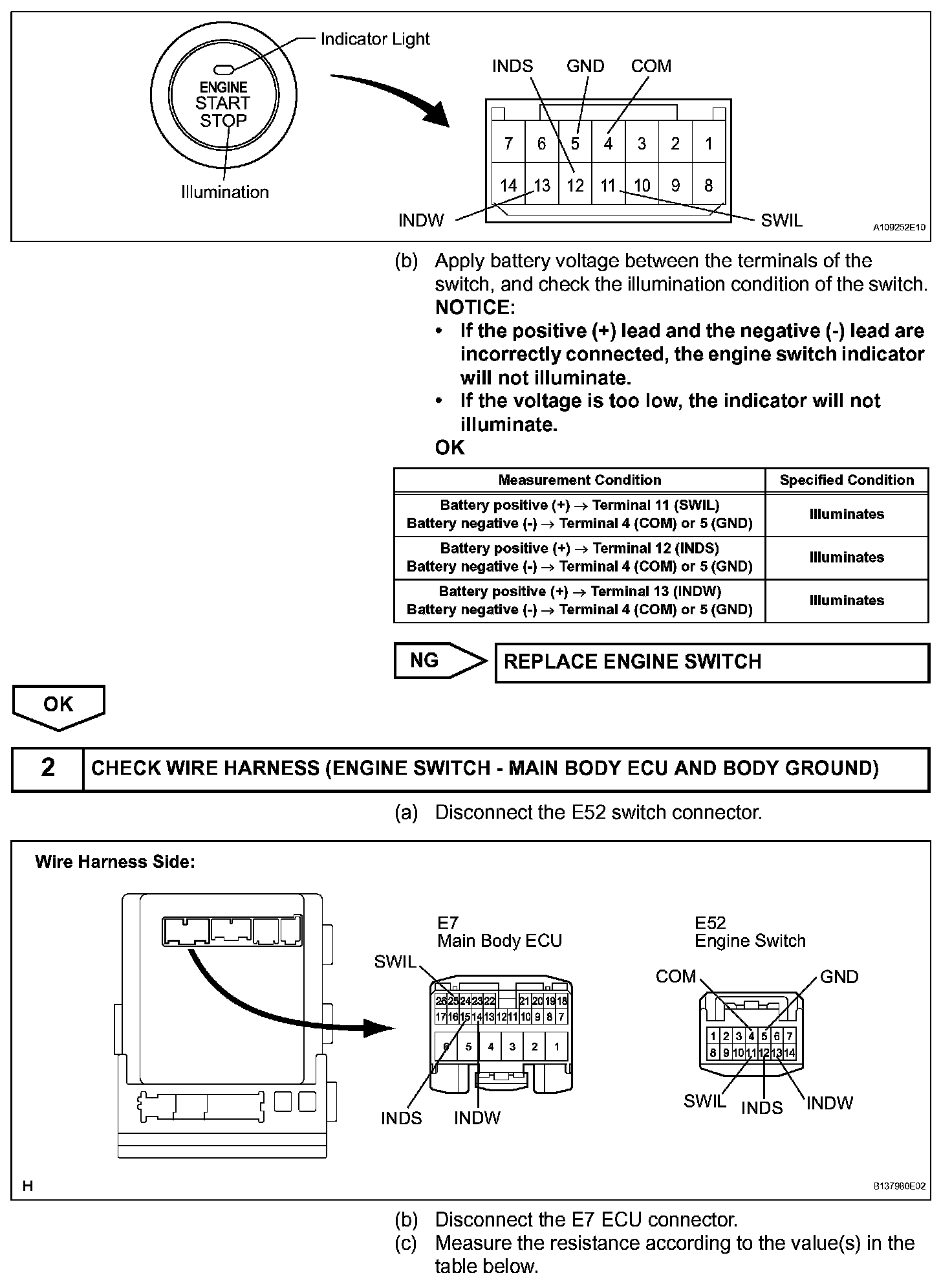 Engine start conditions or system malfunctions can be checked by the status of the engine switch indicator light.