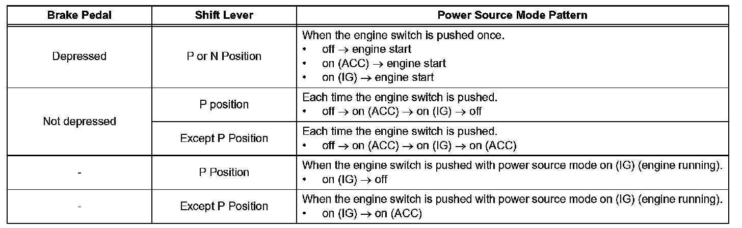 1. Check that power source mode changes in accordance with the conditions of the shift position and brake pedal.