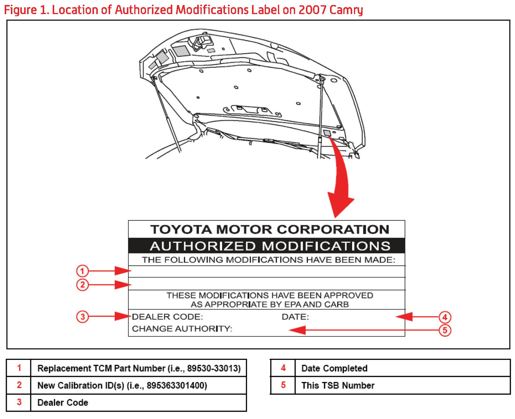 1. Check for the Authorized Modifications Label affixed to the vehicle in the location shown in Figure 1.Confirm if the TCM calibration has been updated. If the calibration ID listed is NOT the latest TCM calibration - go to step 2.