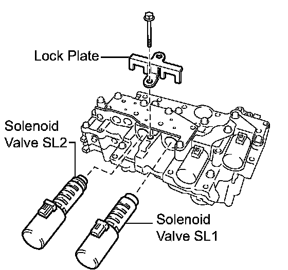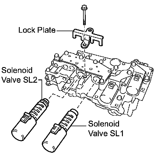 (a) Remove the bolt, lock plate and shift solenoid valve SL2 from the valve body assembly.