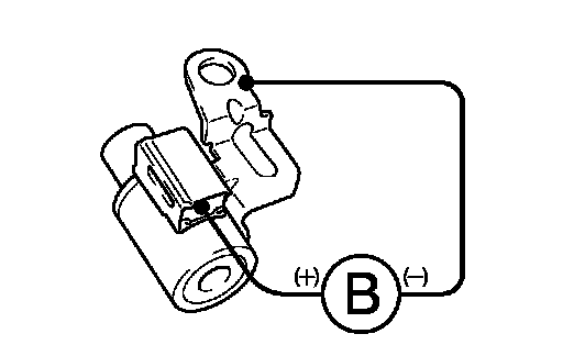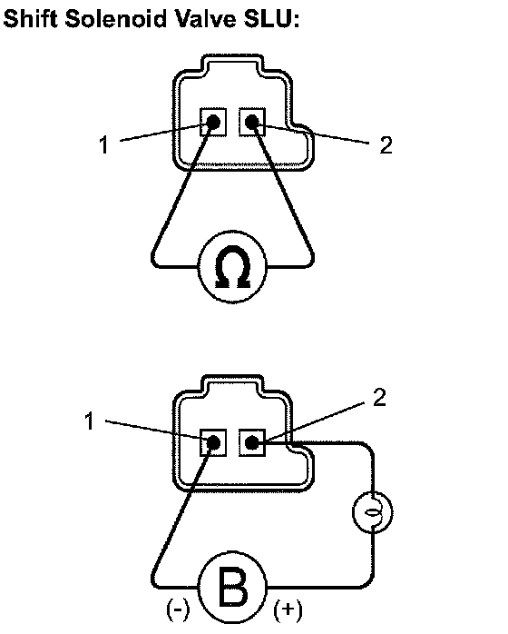(b) Connect the positive (+) lead to terminal 2 and the negative (-) lead to terminal 1 of the solenoid valve connector, then check the movement of the shift solenoid valve.