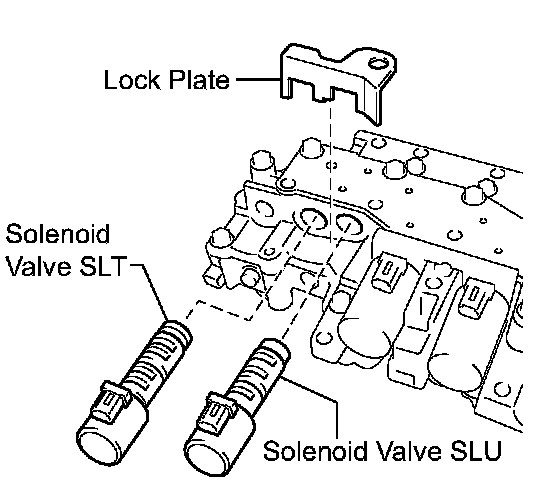 (b) Install the shift solenoid valve SLT and lock plate to the valve body assembly.
