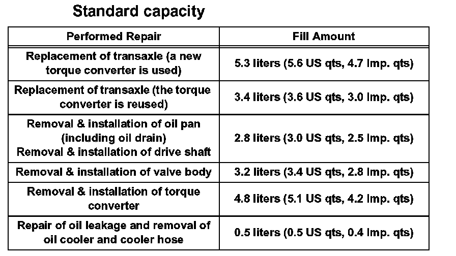 (a) Fill the transaxle with the correct amount of fluid as listed in the table below.