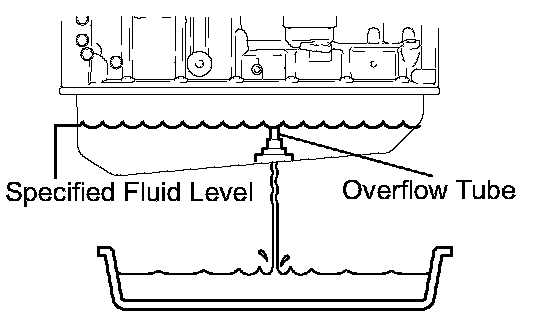 (b) Check that the fluid comes out of the overflow tube. If fluid does not come out, proceed to step 7. If fluid comes out, wait until the overflow slows to a trickle and proceed to step 8.