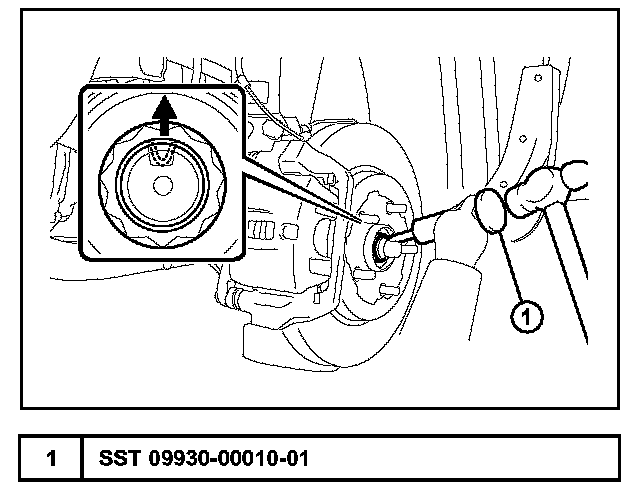 A. Using the SST and a hammer, release the staked part of the front axle hub nut.