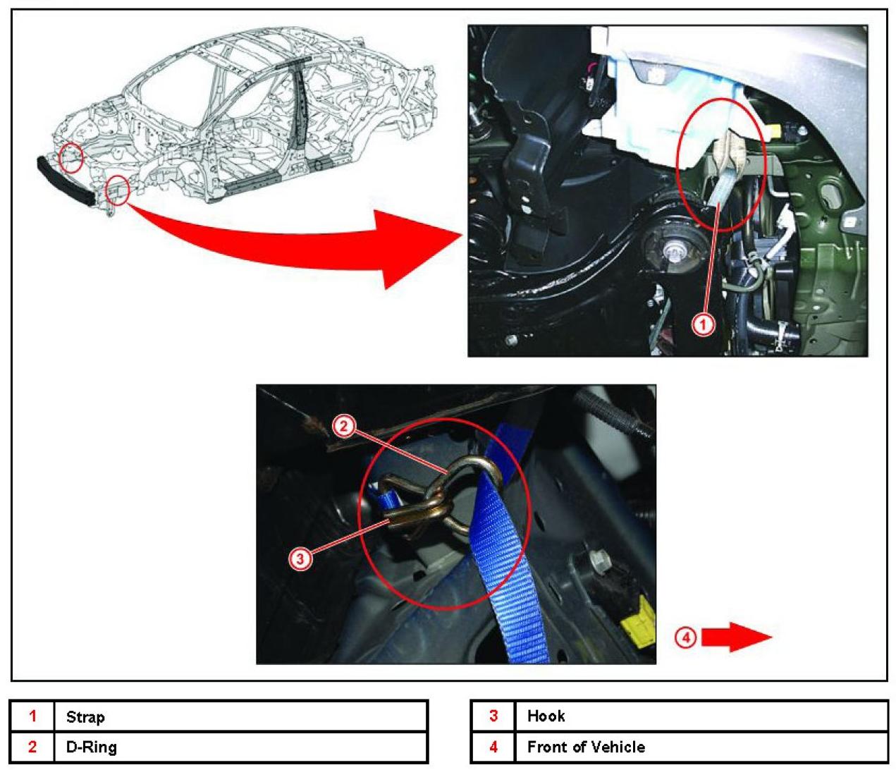 A. Loop the strap over the frame rail rearward of the radiator support and secure the hook to the strap's floating D-ring.