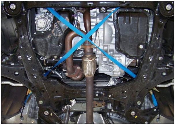 B. Feed the strap over the sub-frame and under the engine in an "X" pattern.