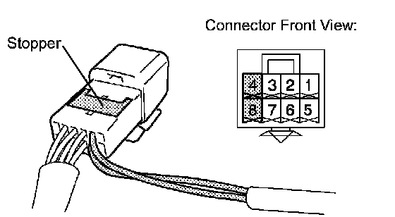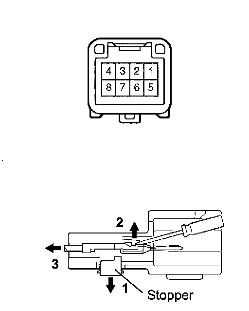 (b) Using a screwdriver, disengage the locking lug of terminals (4) and (8), and pull the terminals out from the rear of the connector.