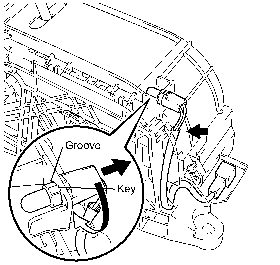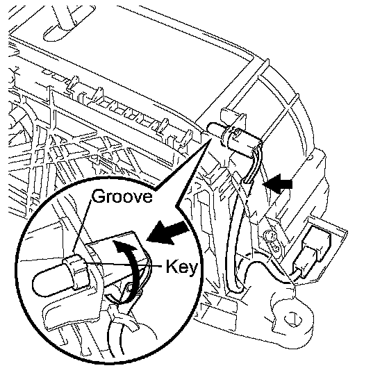 (e) Align the indicator light guide key with the groove on the shift lock control unit to remove the indicator light wire.