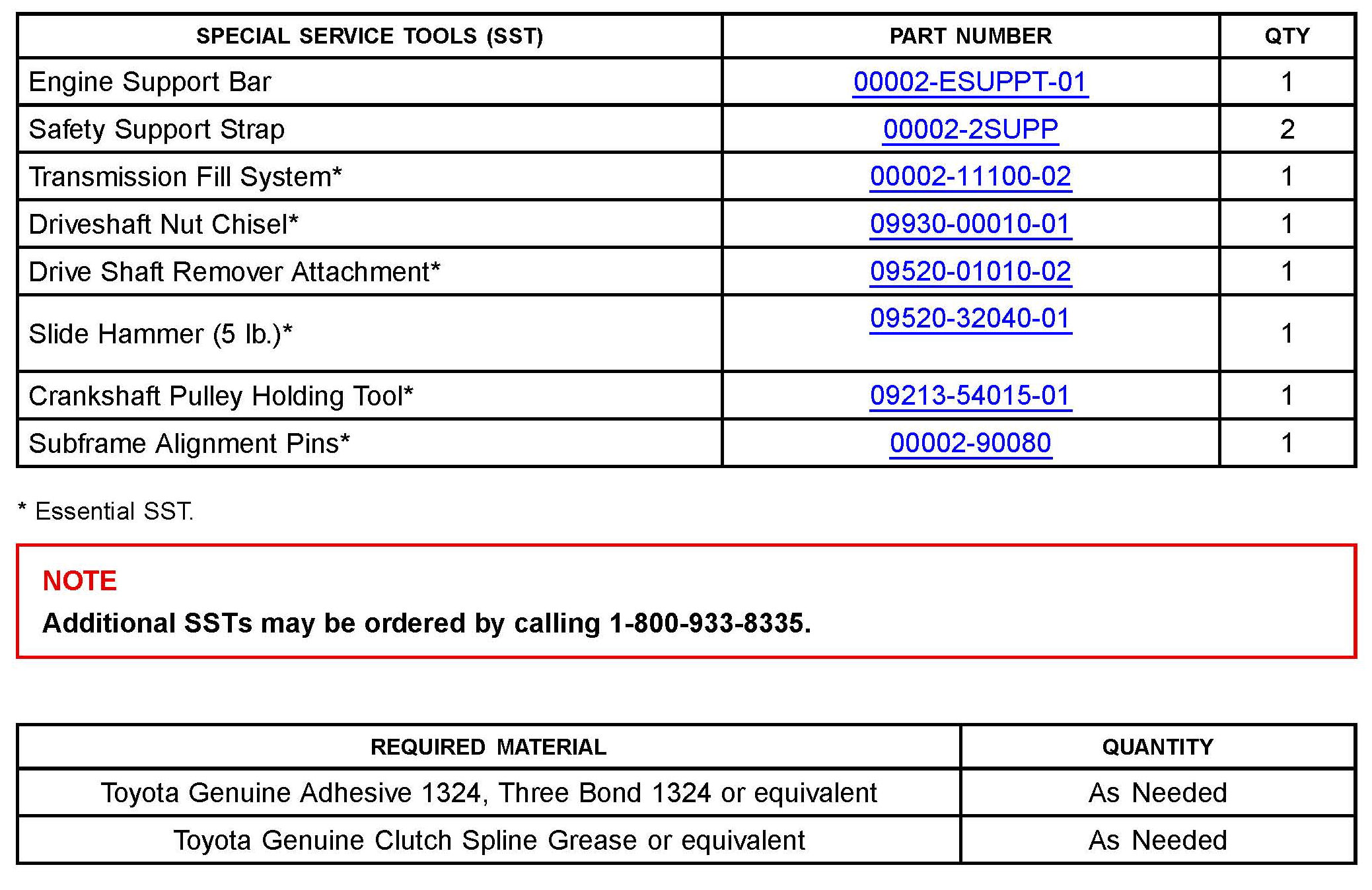 This bulletin supplements the Repair Manual procedures for transaxle removal and replacement with details on the use of a new Engine Support Bar (ESB) SST P/N 00002-ESUPPT-01 to assist in the removal and installation of the transaxle assembly. With the use of the Engine Support Bar it is no longer required for the engine assembly to be removed from the vehicle when removing and installing the transaxle assembly.