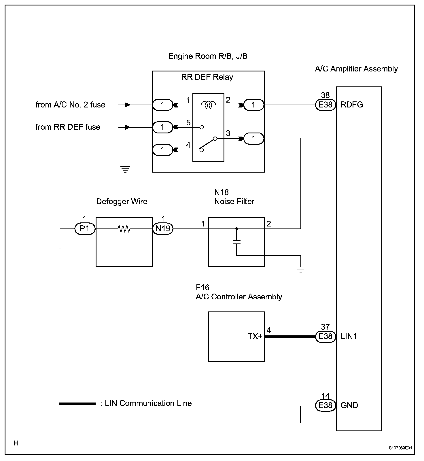 When the rear window defogger switch, which is built into the heater control assembly, is operated, the operation signals are transmitted to the A/C amplifier assembly through LIN. When the A/C amplifier assembly receives the signals, it turns on the DEFOG relay to operate the rear window defogger.