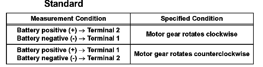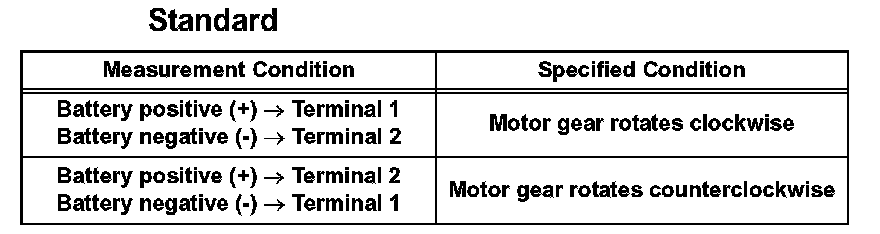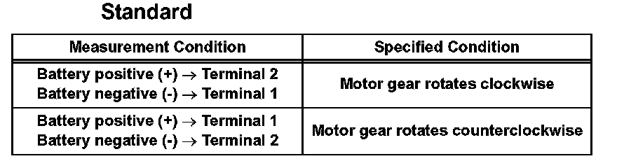 a. Apply battery voltage to the motor connector according to the table below.
