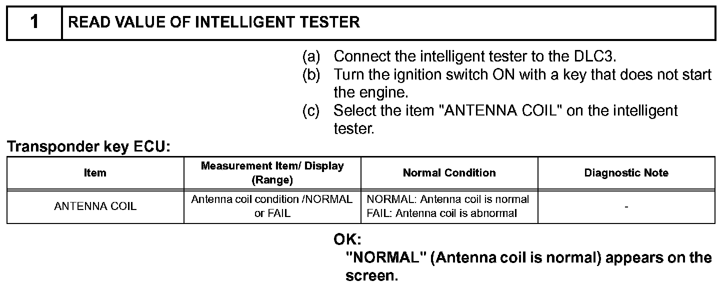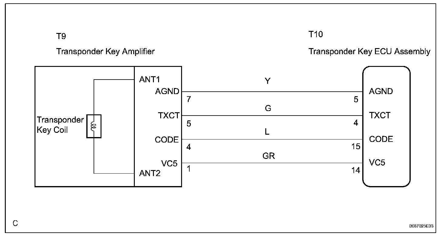 The transponder key coil is built into the transponder key amplifier and receives a key code signal from the transponder chip in the key. This signal is amplified by the amplifier, then it is output to the transponder key ECU assembly.
