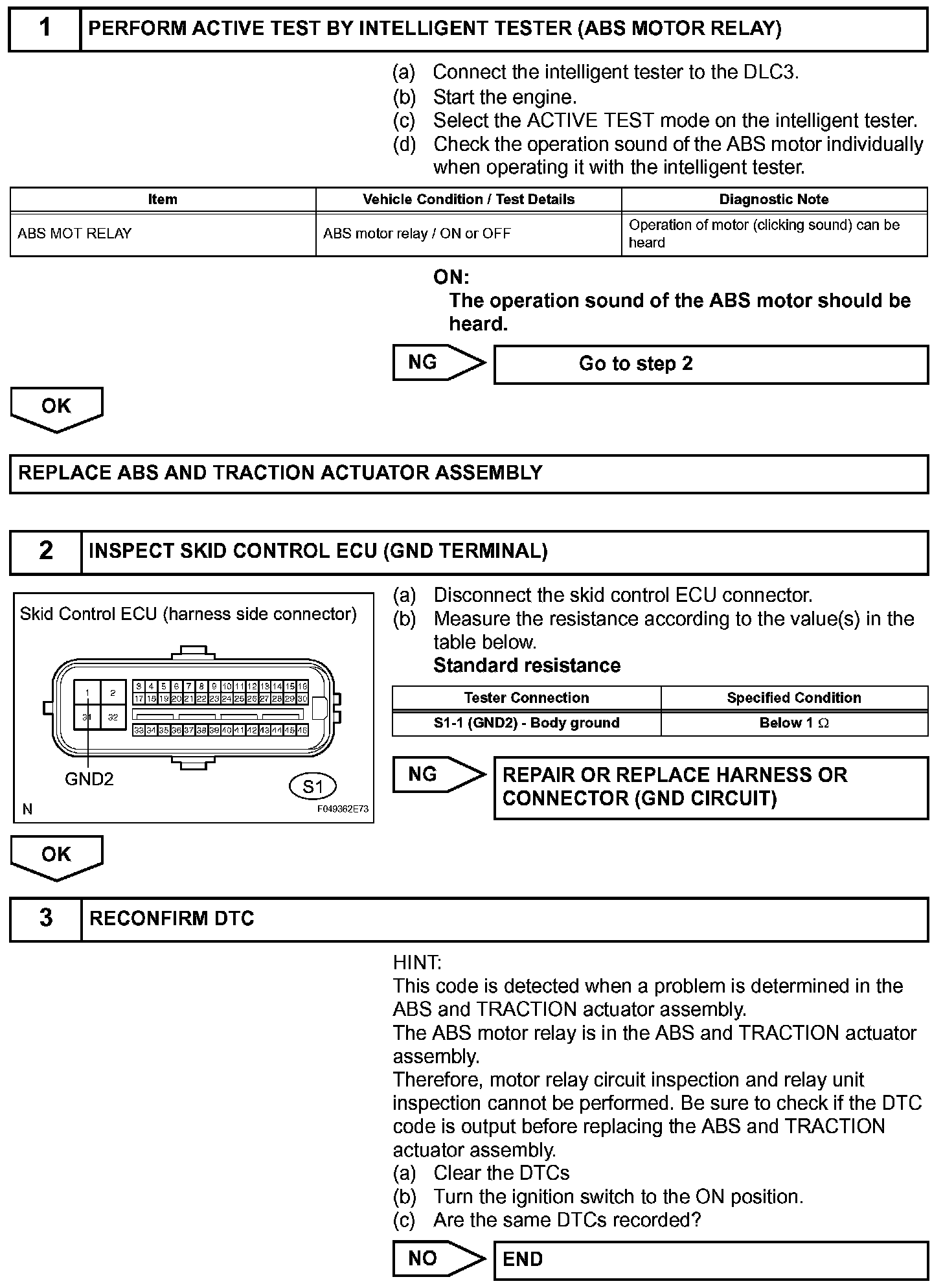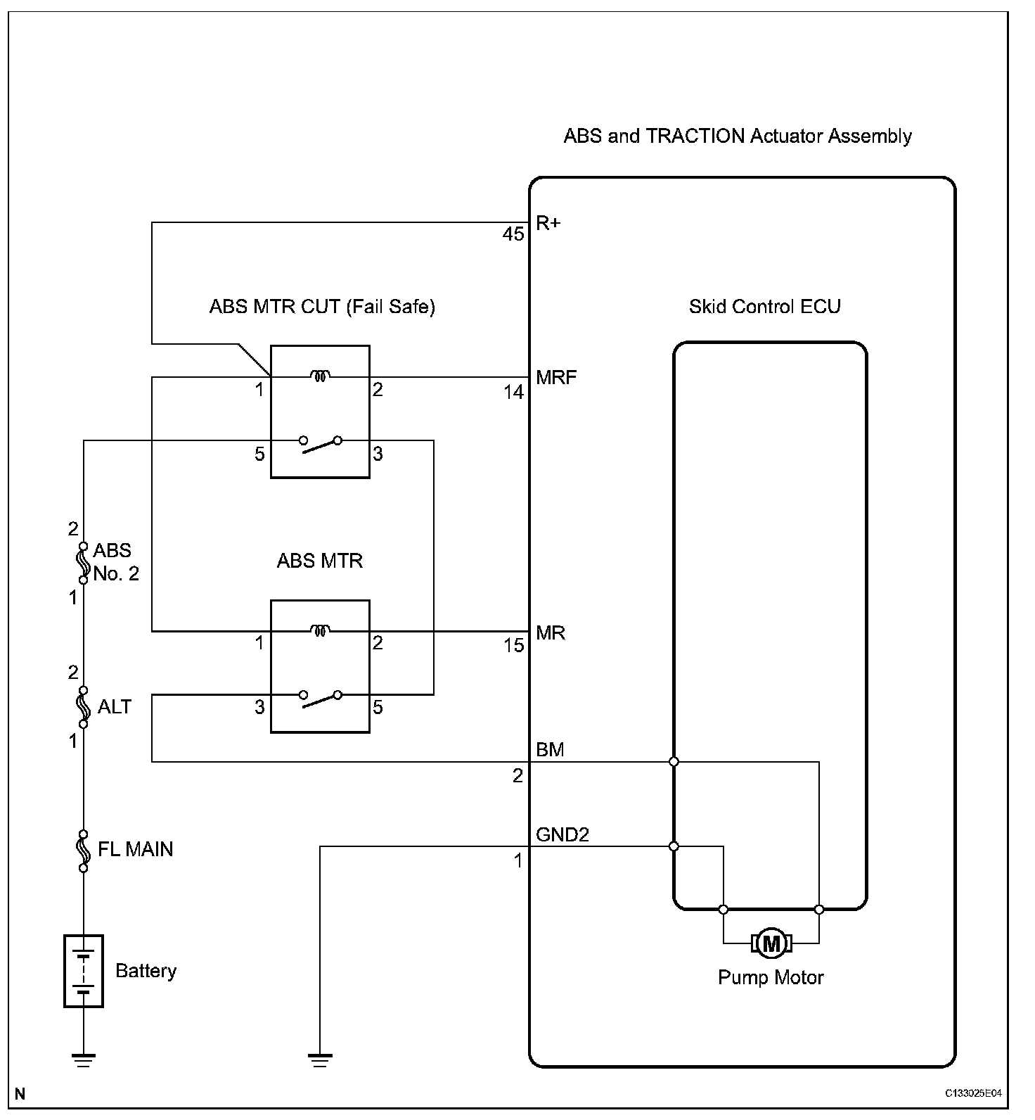 The ABS pump motor is located inside the brake actuator. The motor is used for BA, TRAC and VSC operation.